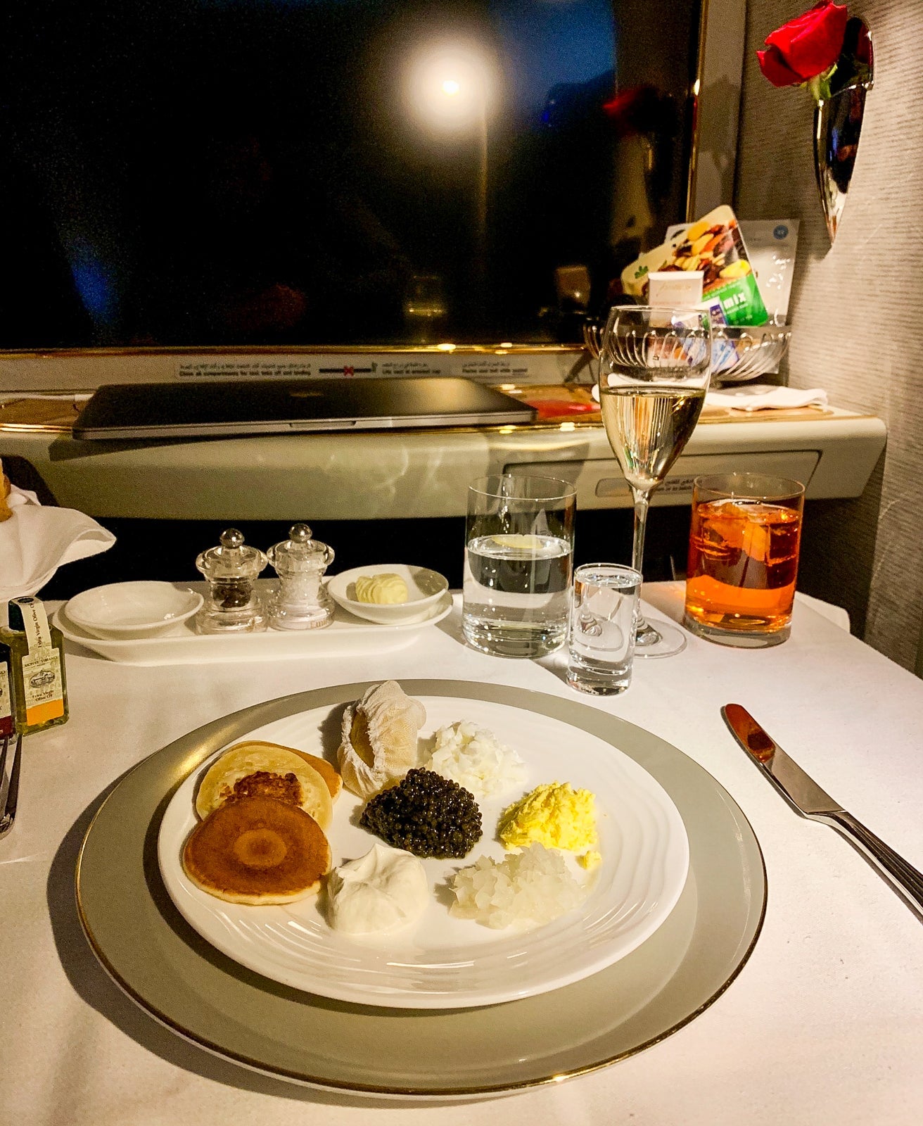 It wasn't all glamorous though (and this is entirely my fault). As I was ordering my caviar, the FA asked me if I'd like it served with the traditional shot of vodka, to which I replied (apparently without thinking), "Sure, why not!" I then got up to go to the bathroom and then waited a few minutes for the caviar to be served after I'd returned.