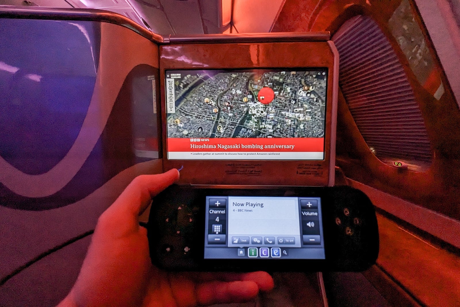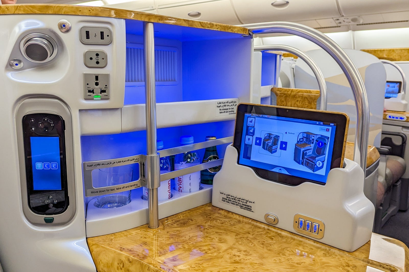 On the larger armrest of my window seat was a handheld remote, a handheld tablet to control the various seat functions, a universal charging plug, a reading light, a headphone jack and two USB-A charging ports. Emirates is one of the only airlines with an in-seat "minibar," though the drinks are at room temperature since it's not refrigerated.