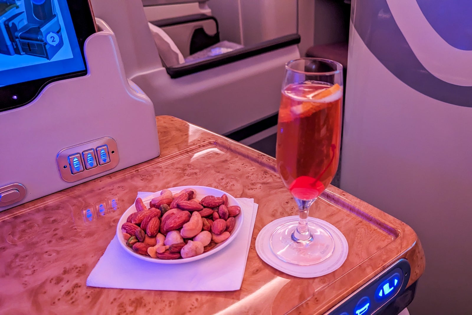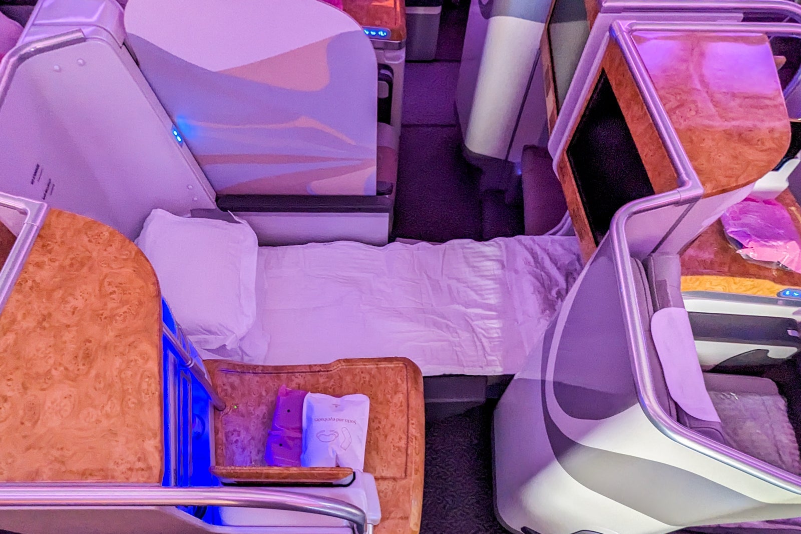 The seat reclined fully flat via buttons on the side shelf (or the wood-paneled handheld tablet). While the short flight length and the allure of the onboard bar meant I only had a few hours to sleep, it was a comfortable bed with good cushioning in the seat and good support for my head from the large pillow. The cabin was also kept at a nice, cool temperature for sleeping.