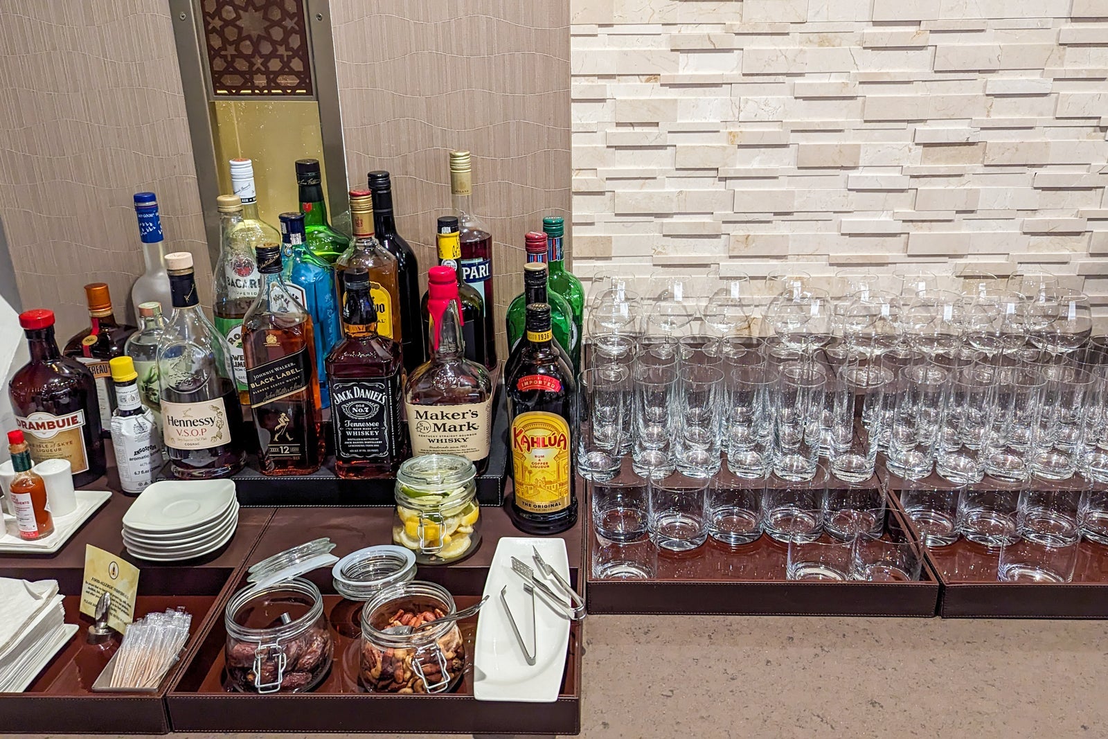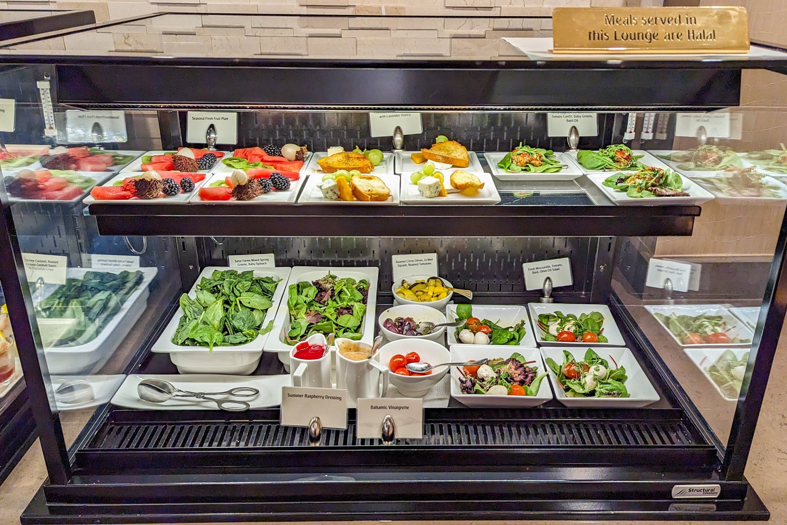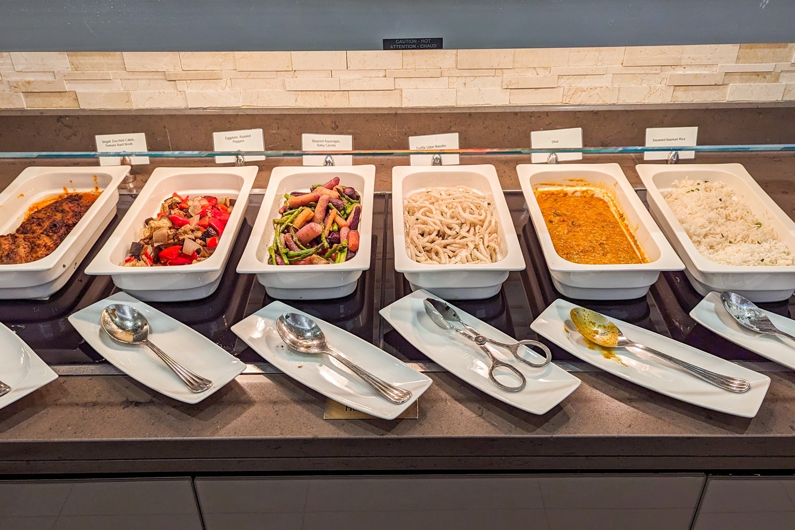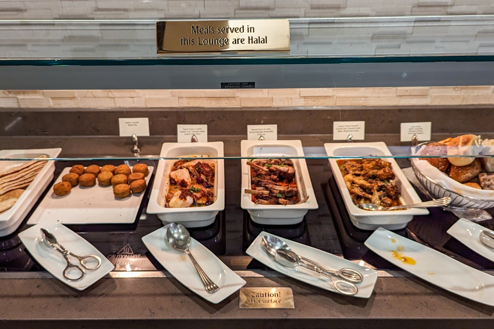 An extensive buffet of hot and cold dishes, such as roasted rack of lamb and zucchini cakes in the dining area looked freshly prepared and neatly presented. In short, this is a lounge worth arriving slightly early for.