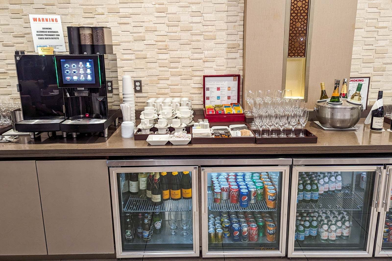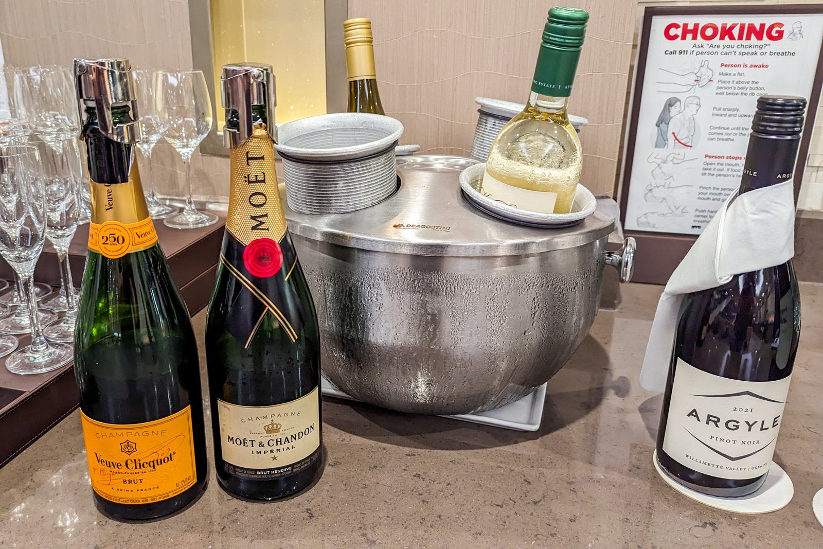 Passengers could choose from both Moet & Chandon Imperial and Veuve Cliquot Champagnes, as well as name-brand spirits like Johnnie Walker Black Label whisky, Grey Goose vodka and Jose Cuervo tequila. Coca-Cola and Pepsi soft drinks were stocked in the refrigerators, along with San Pellegrino sparkling water and Acqua Panna still water.