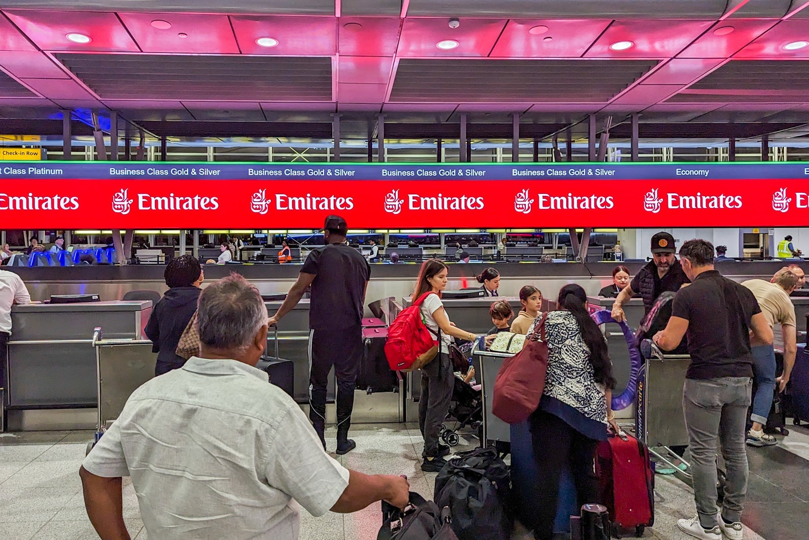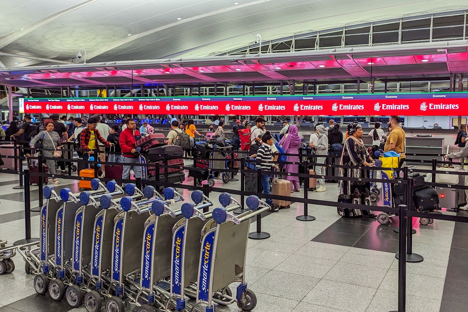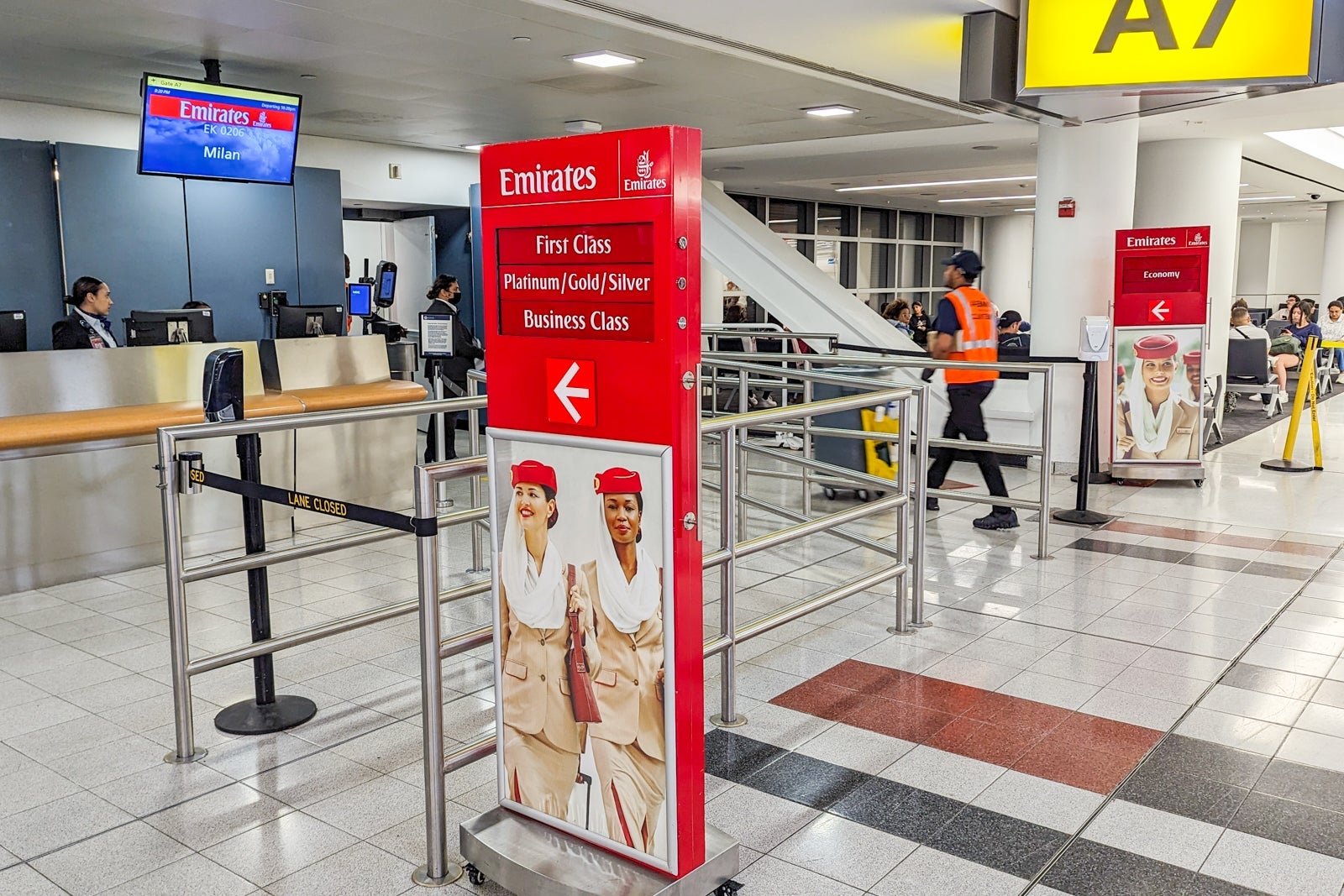 Another Emirates A380 flight departs just 40 minutes after the flight to Milan (that one operating nonstop to Dubai), so Emirates fields a huge check-in area to cater to more than 1,000 evening passengers.