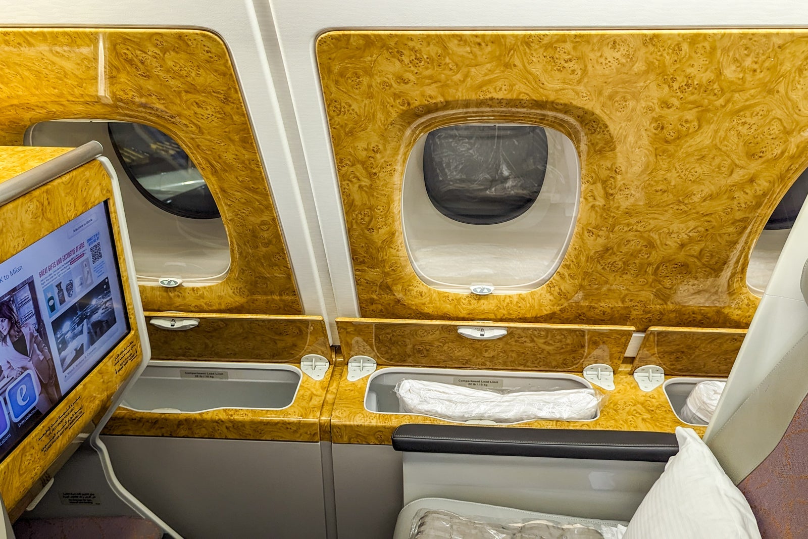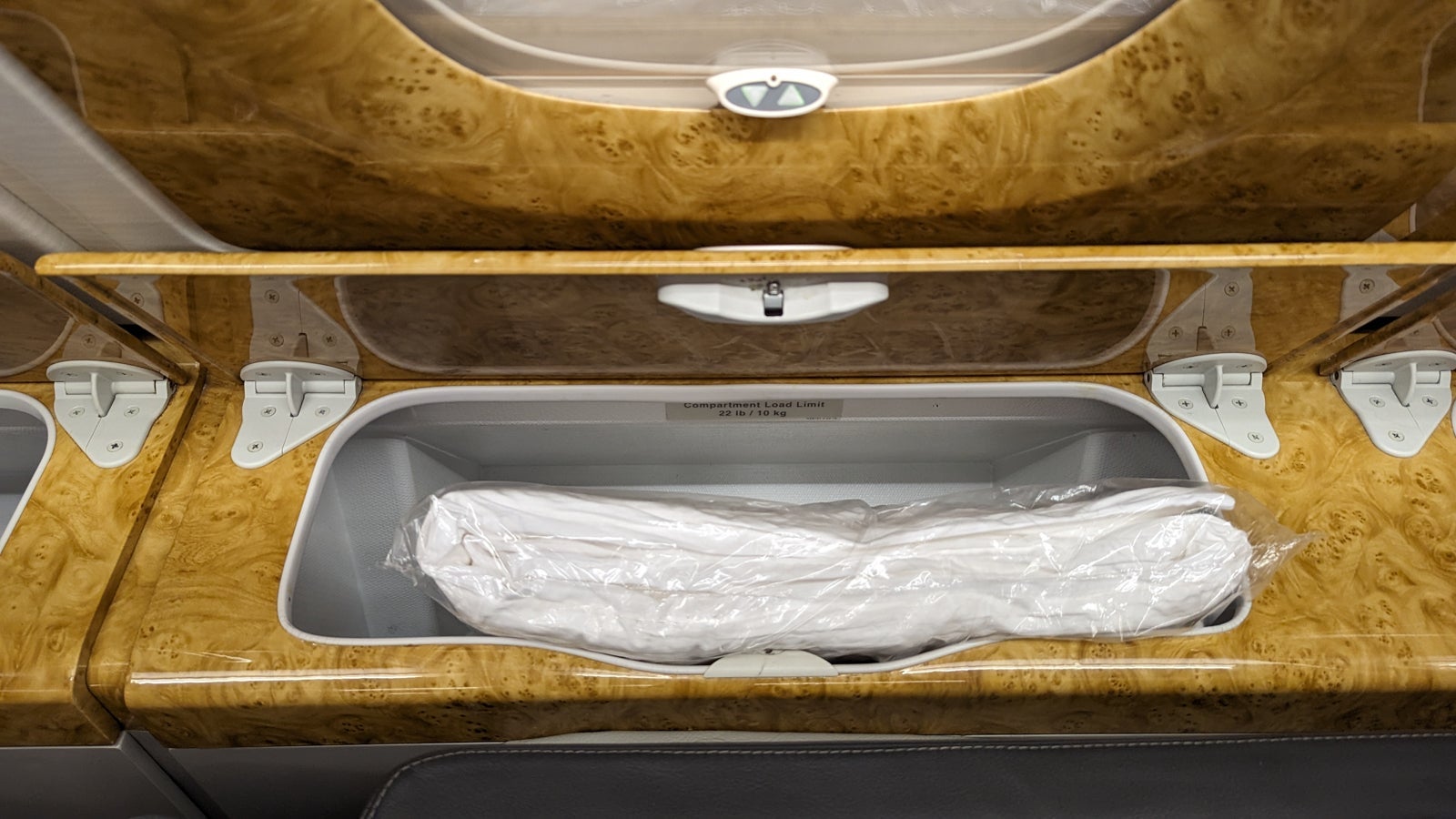 Thanks to the curved fuselage of the A380's upper deck, there were two large storage bins under the window — another reason why the window seats are a great choice for solo travelers.