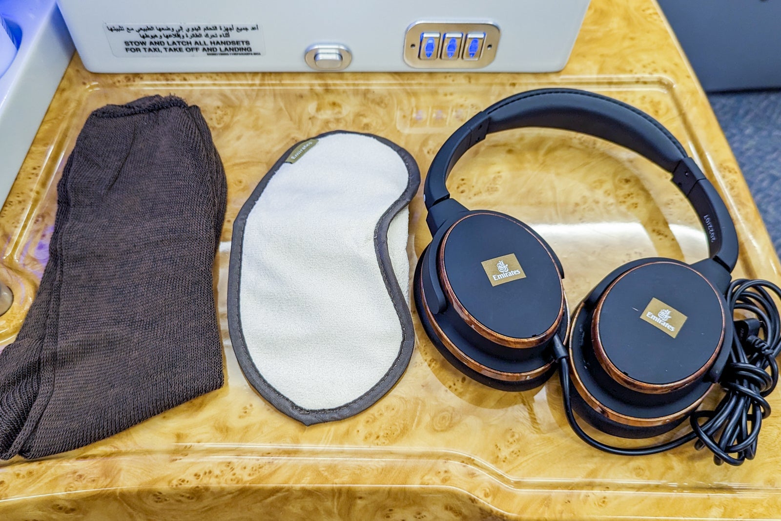 Noise-canceling Emirates-branded headphones were also waiting on my seat, as was an eye mask and sleep socks in beige and brown tones. Pajamas are not provided in Emirates business class.