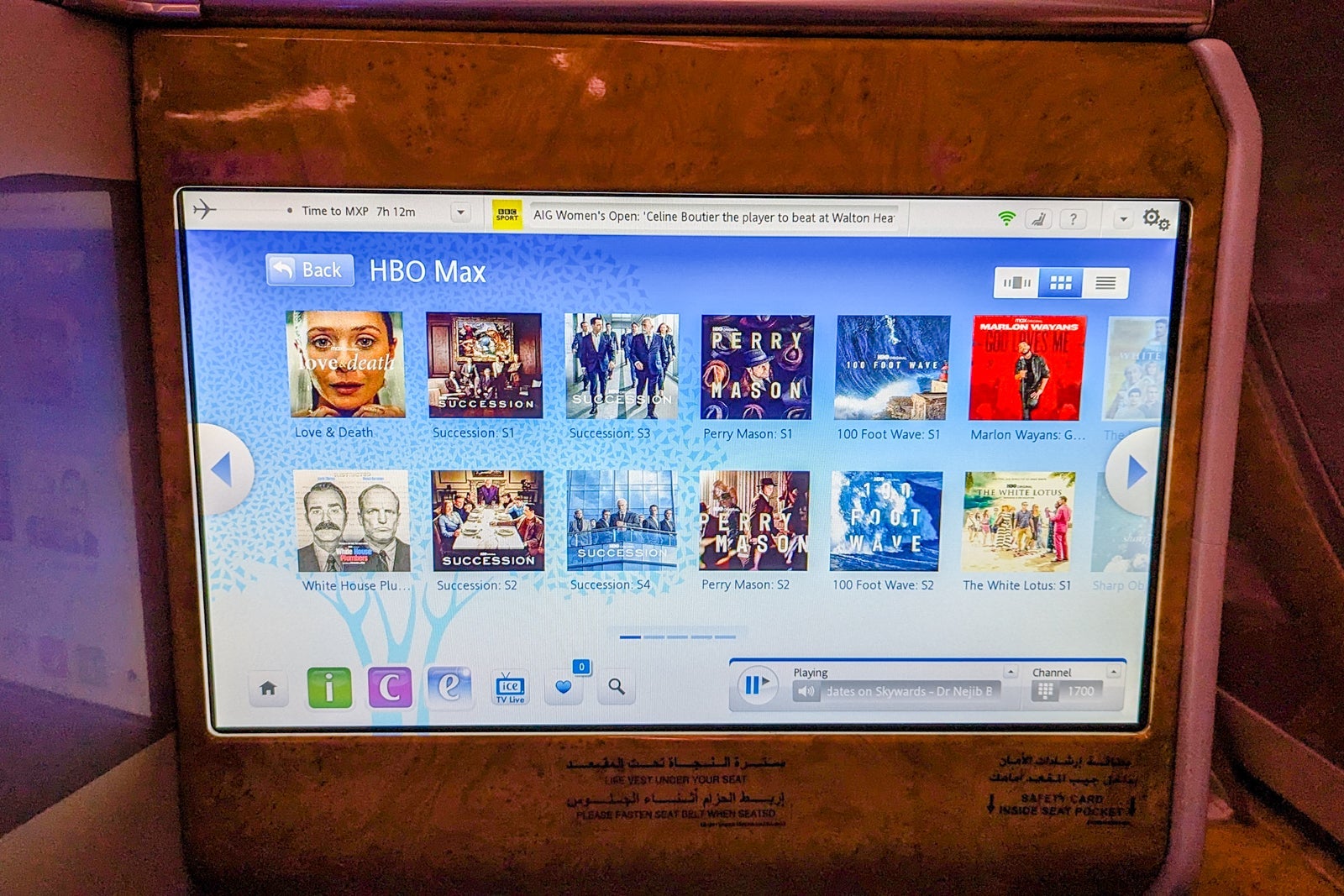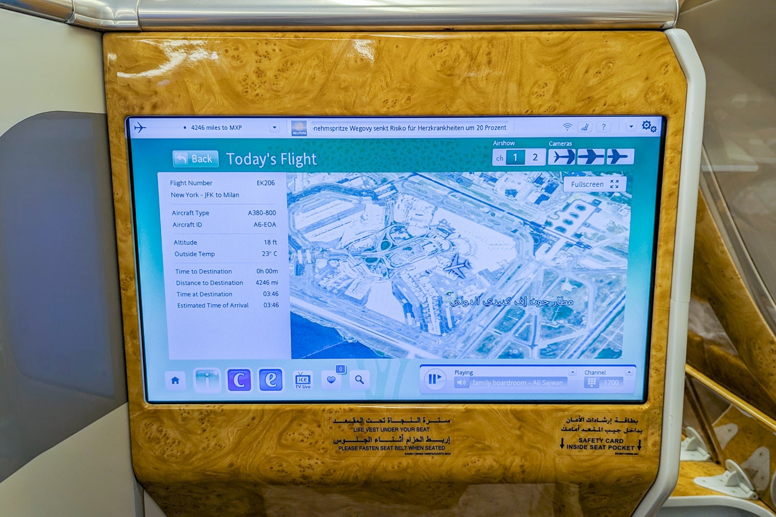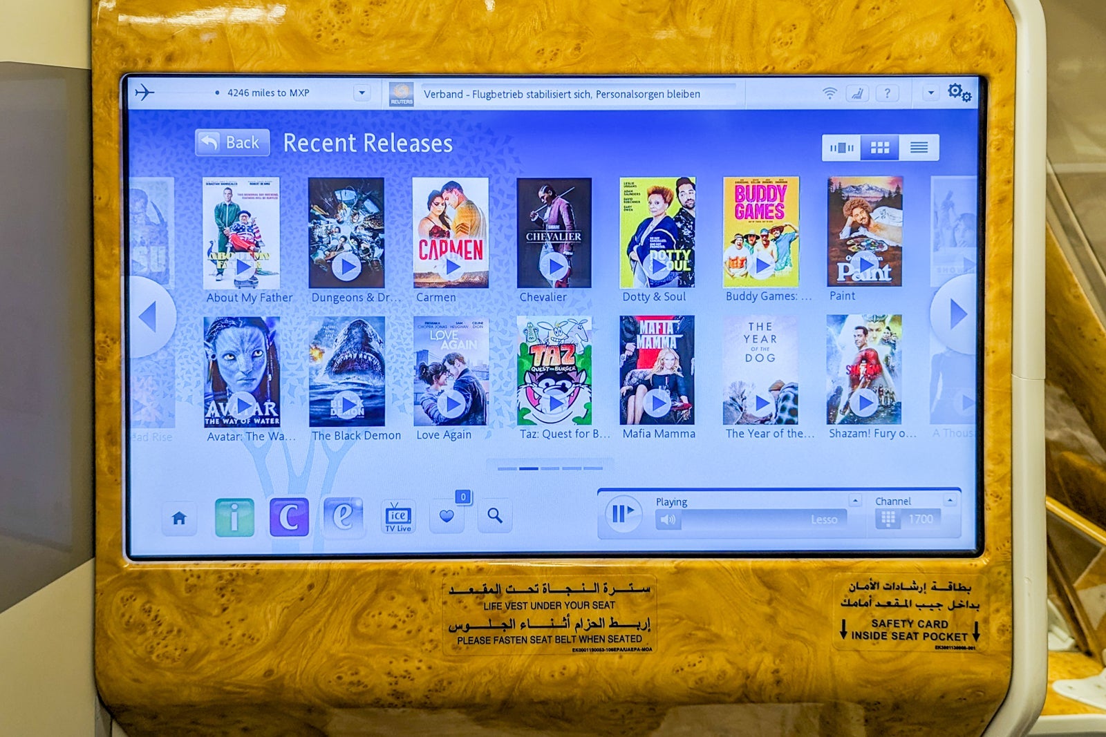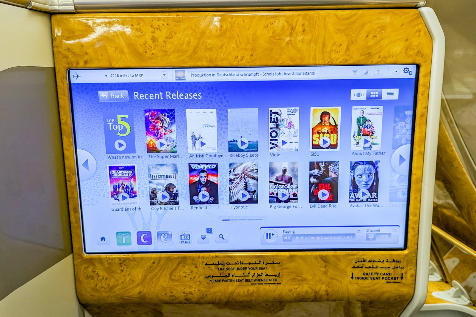 Among the dozens of new release movies were "Avatar: The Way Of Water," "About My Father," "Mafia Mamma" and "The Menu." There was also plenty of information about the aircraft and details about arriving or transiting in Dubai.
