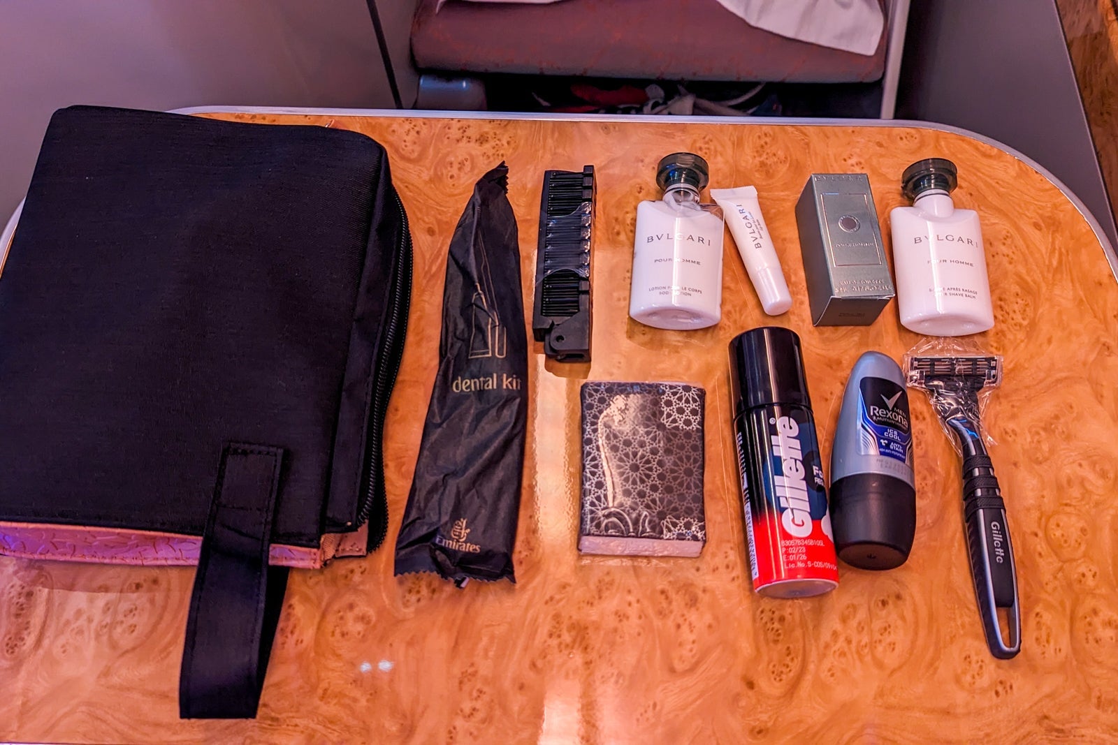 It was generously filled with opulent Bulgari pour homme eau de toilette, body lotion, after-shave balm and lip balm. They also had non-Bulgari shaving cream and a razor, roll-on deodorant, a comb, a dental kit and tissues.