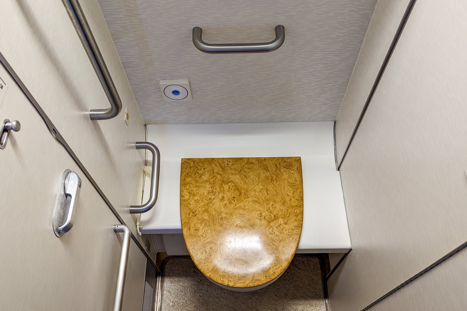There was a huge amount of glossy wood paneling, and the beige and gray swirls on the hardbacks of the seats felt a little dated. Still, it felt like an enormous amount of money had been spent on this cabin.