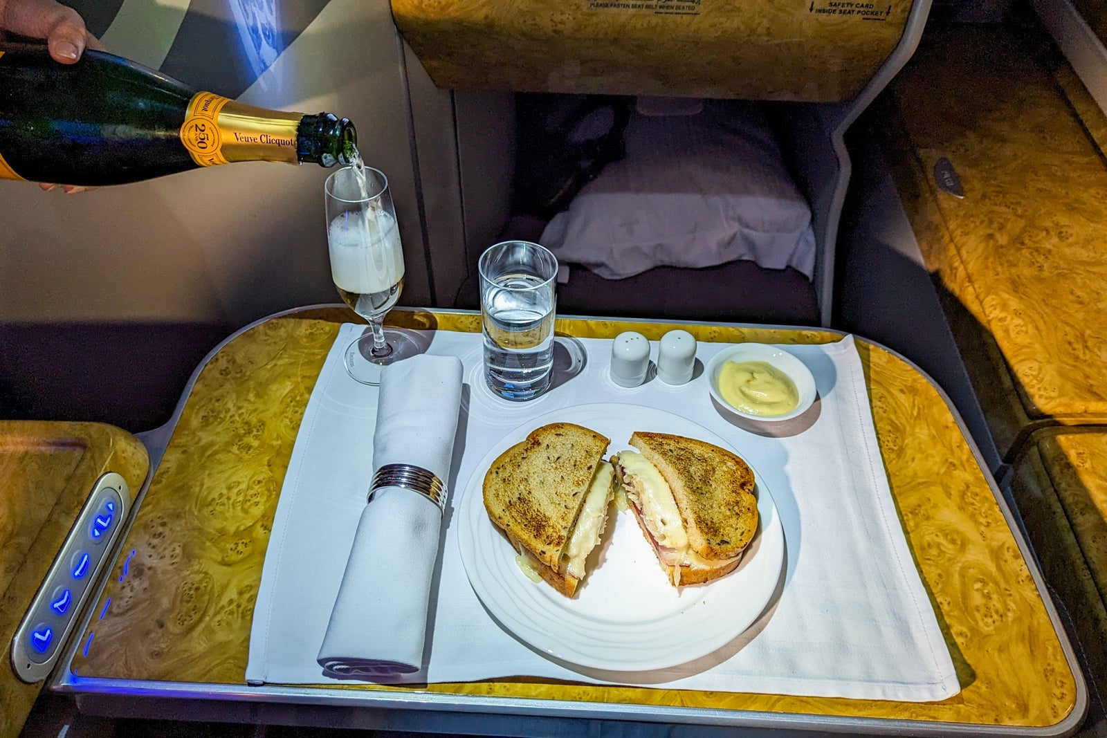 During boarding, the cabin crew offered a choice of pre-poured Veuve Cliquot, orange juice or water, and food and wine menus.