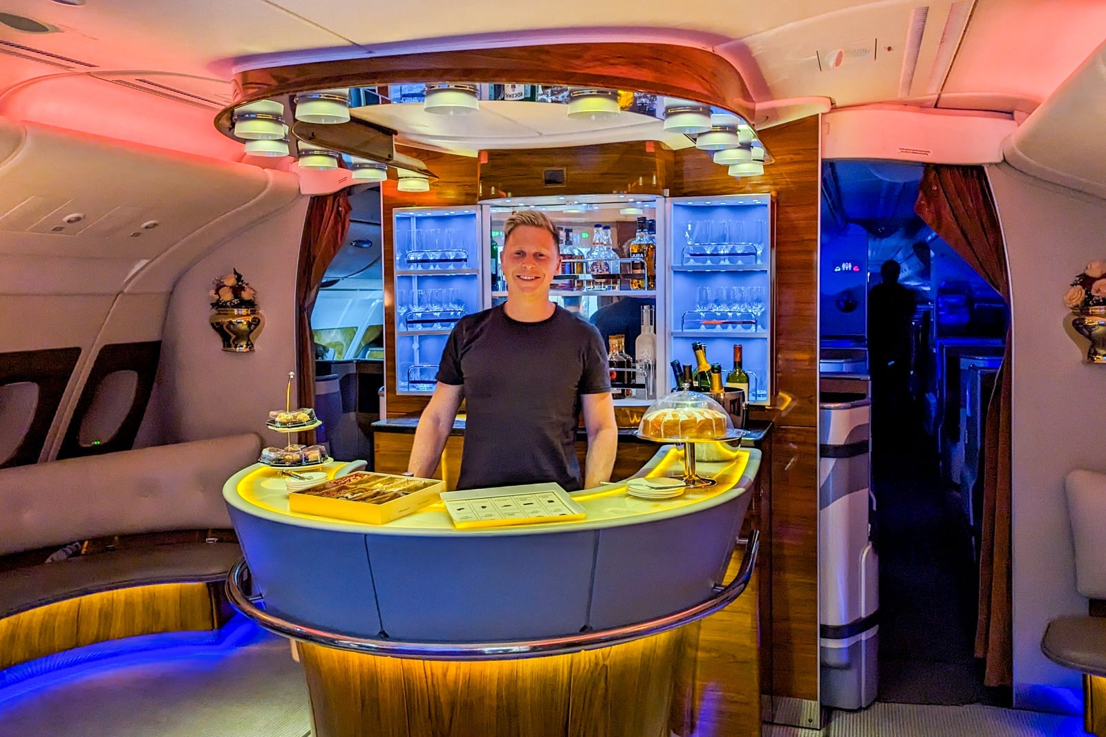 Before you even ask, the crew will likely offer to take a photo of you behind the bar (but don't hesitate to ask, even if they don't). It's the ultimate Emirates A380 business-class souvenir.