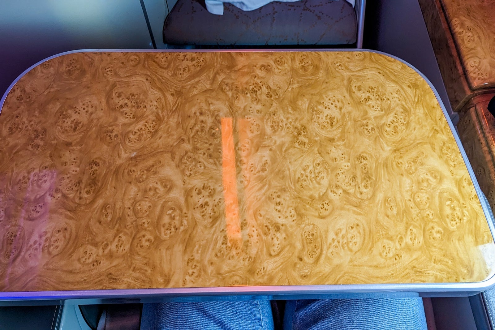 The large, burnished tray table swung out from the larger armrest and was more than enough for a full-size laptop or meal. It could slide forward and back so passengers could easily get in and out of the seat.