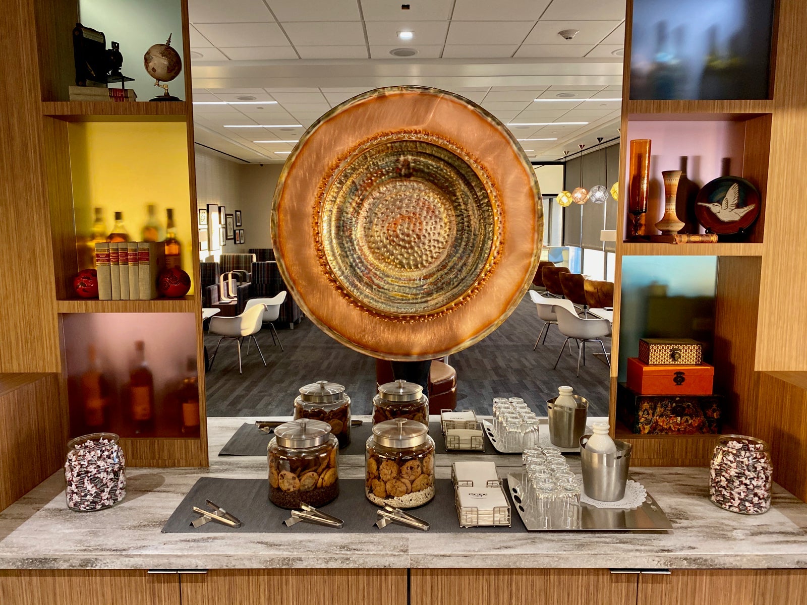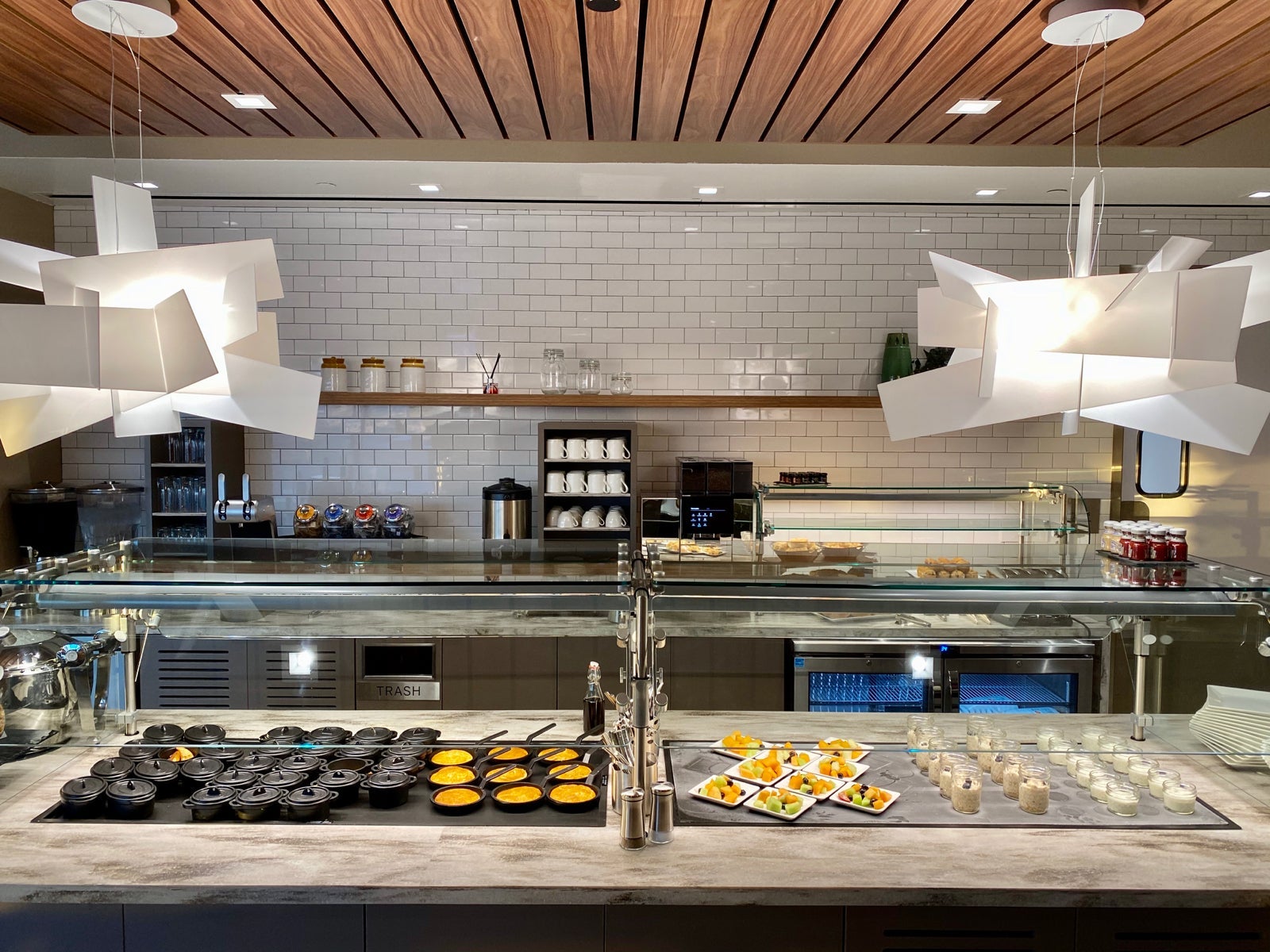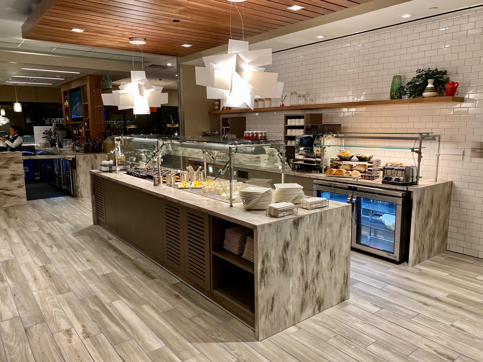 Just past the bar is the lounge's buffet, as well as seven two-top tables that'd be great for travelers looking to eat and work at the same time. These tables are accented by the beautiful backdrop of the Arizona desert.