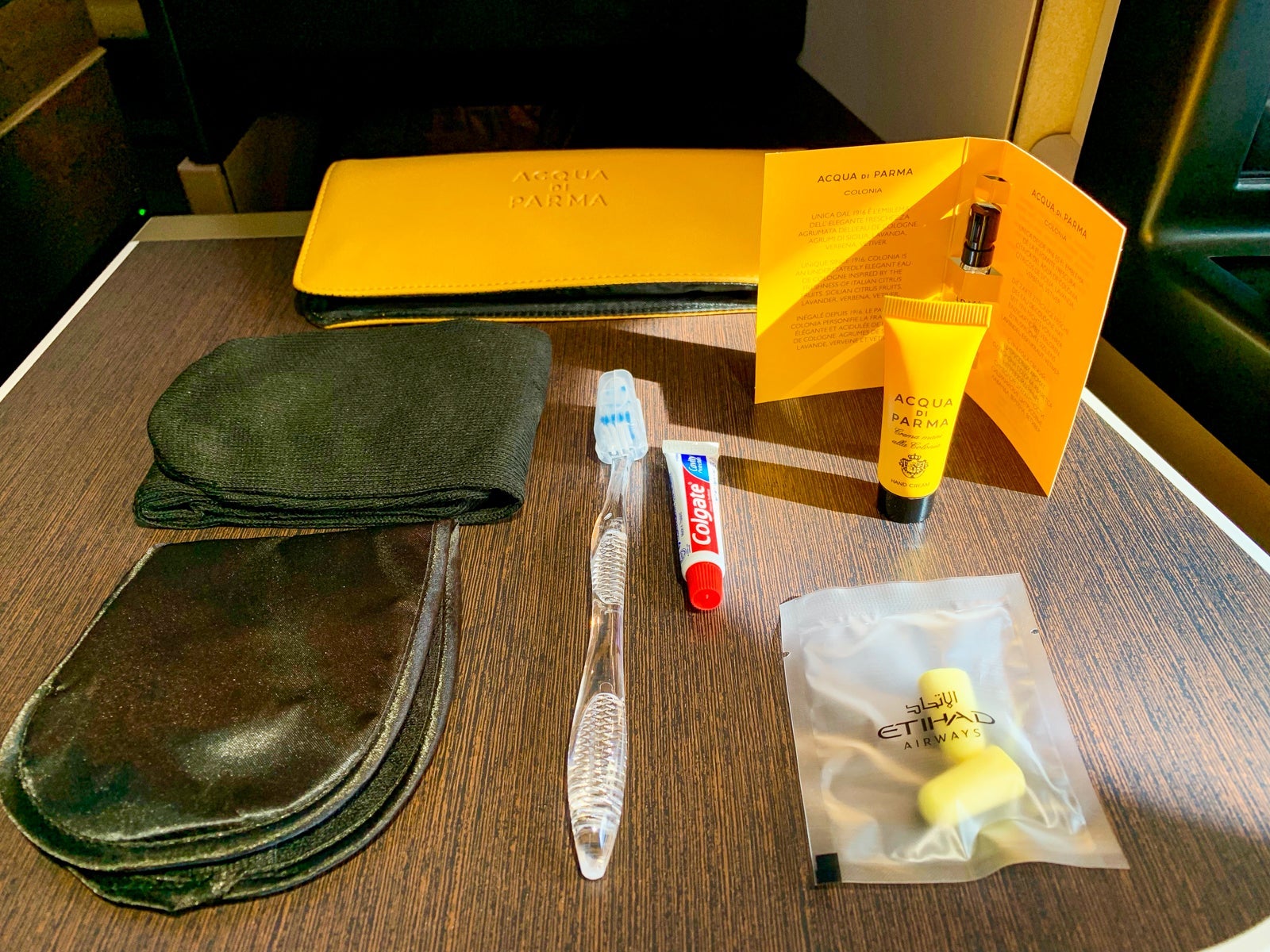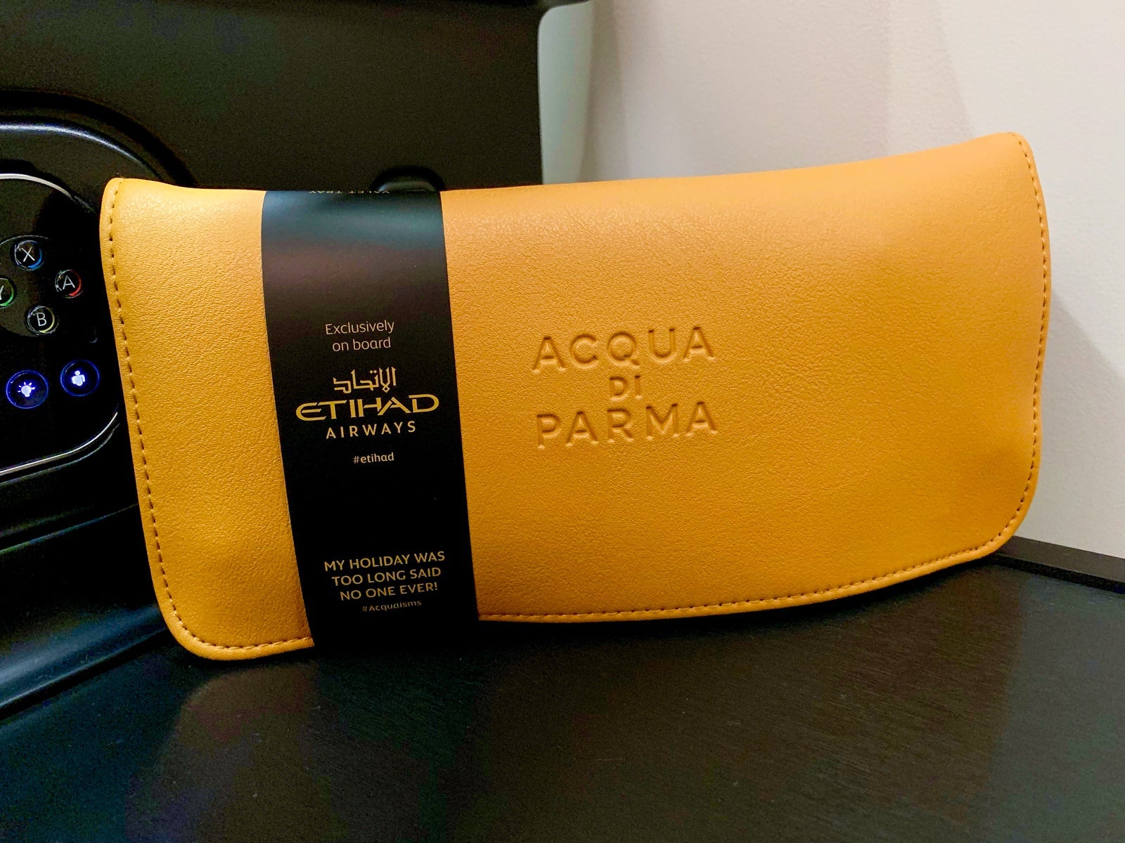 Etihad provided an orange-leather Acqua Di Parma amenity kit, which felt high-quality.