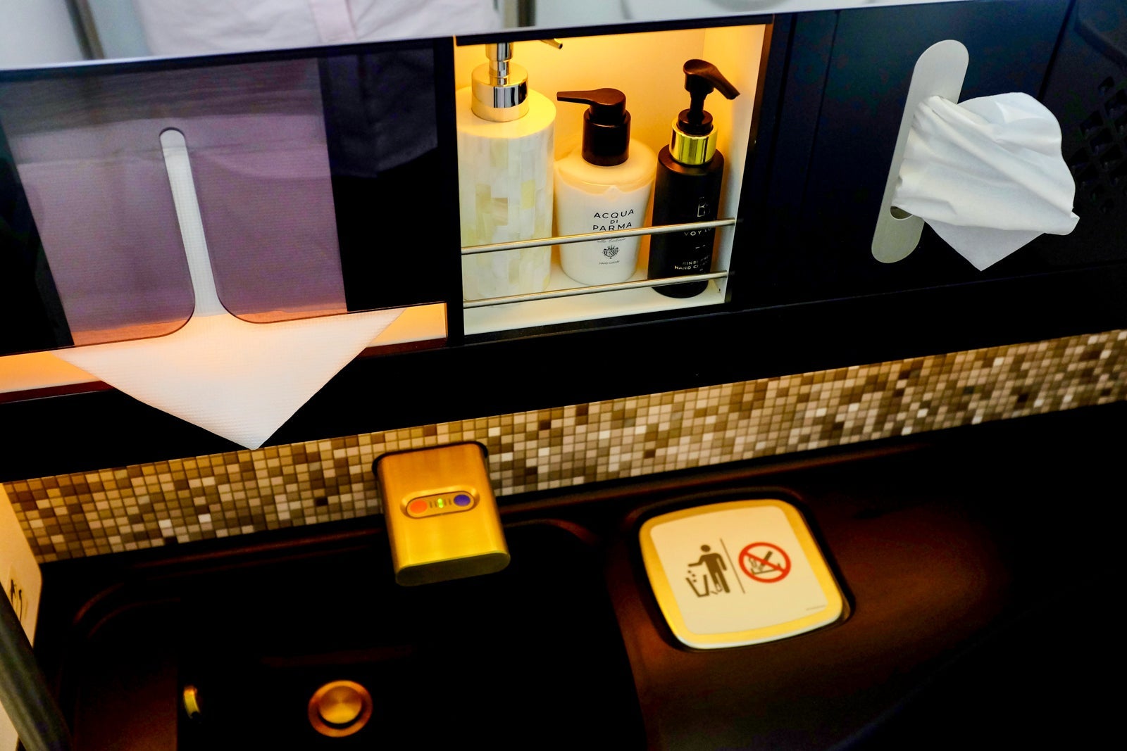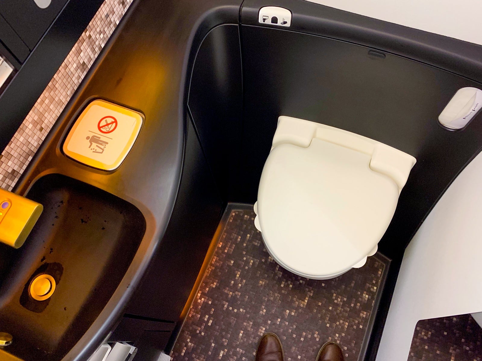 The 26 business-class passengers had access to two dedicated lavatories at the front of the cabin. They were fairly standard in size, but staying true to Etihad's brand, they were elegantly decorated with dark and tan accents throughout.