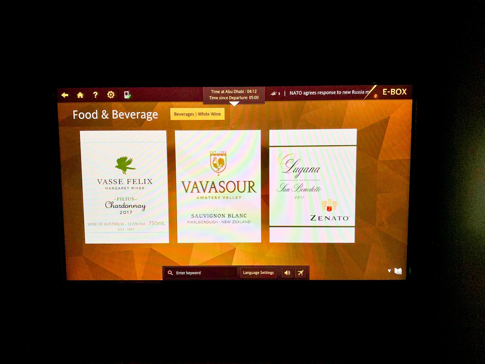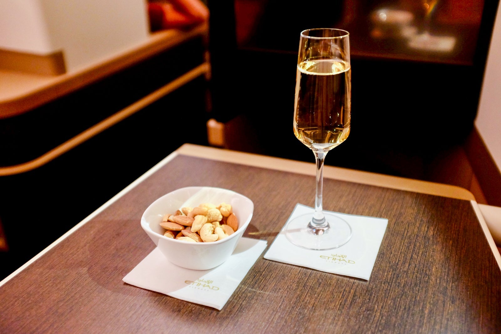 Dinner orders were taken prior to departure to ensure that the flight attendants could quickly get the service started after takeoff. Sure enough, about 20 minutes after we lifted off from the runway in Abu Dhabi, the dinner service commenced with warm mixed nuts and a beverage. I selected another glass of Champagne.