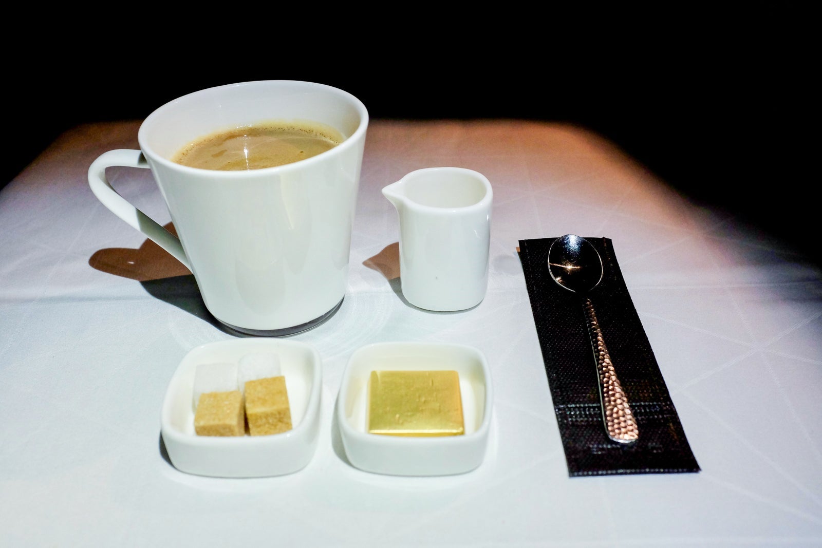After dessert was cleared, the flight attendant offered a round of tea and coffee before bed.