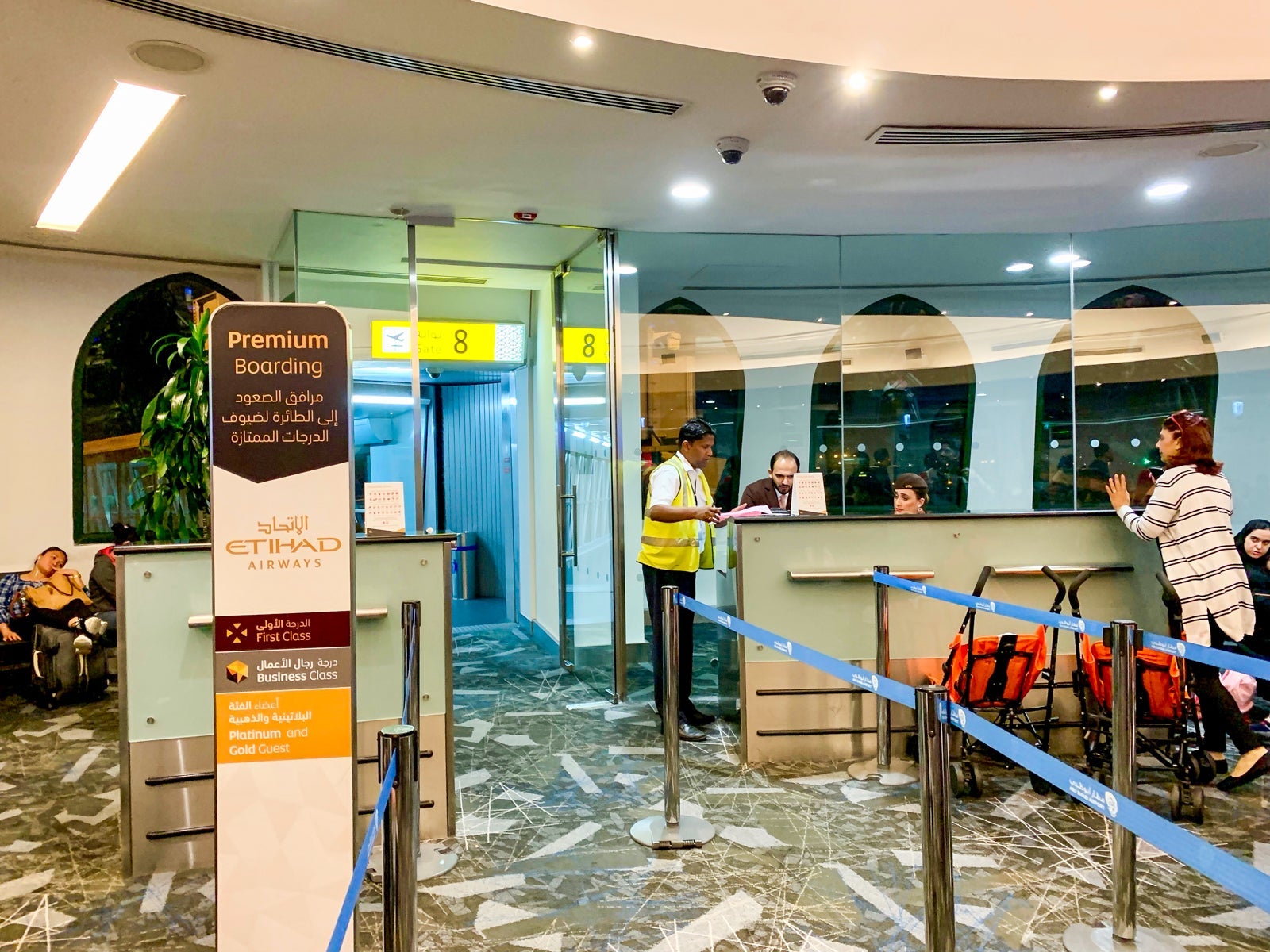 About 45 minutes before departure, the agents opened the boarding gate. Although some of Etihad's 787-9s are equipped with a small first-class cabin, this one only featured business and economy, so boarding commenced with business-class passengers. I was first in line and first aboard the plane.