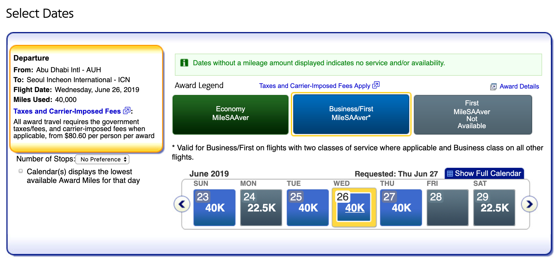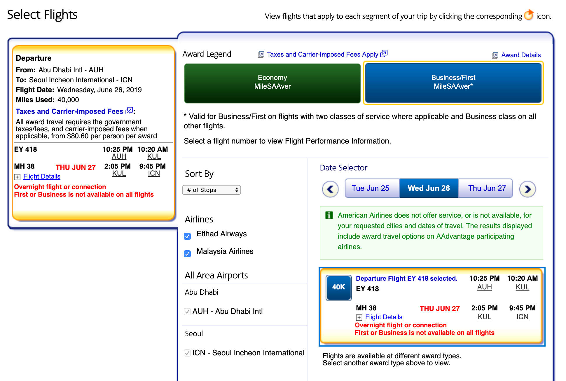 We booked this flight as part of an itinerary originating in Abu Dhabi, United Arab Emirates (AUH), and terminating in Seoul, South Korea (ICN). Etihad currently runs an A380 nonstop between the two cities (meaning you can book nine hours in its incredible first-class Apartment for just 50k miles!), but it wasn't available the dates I was looking to fly.