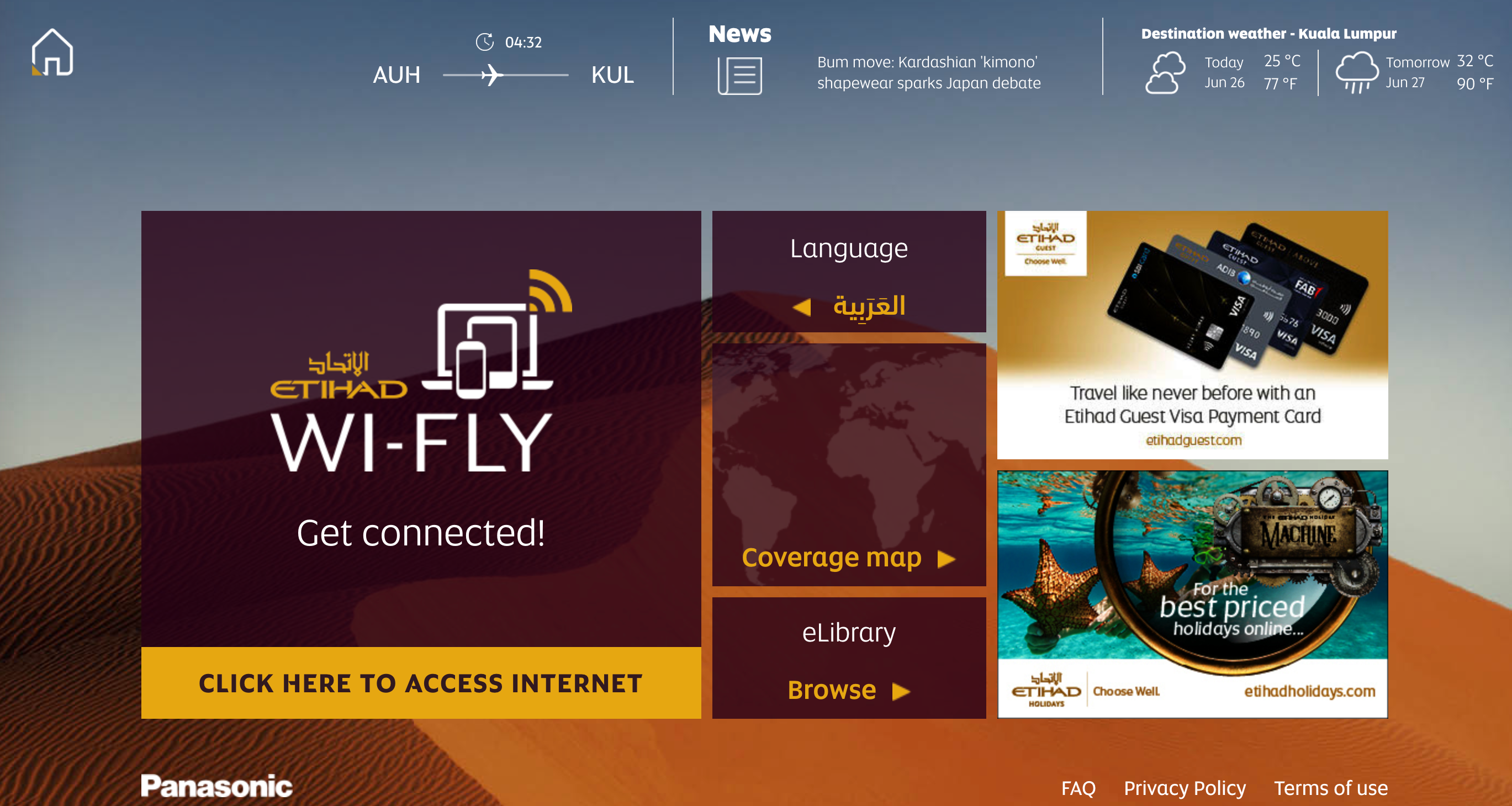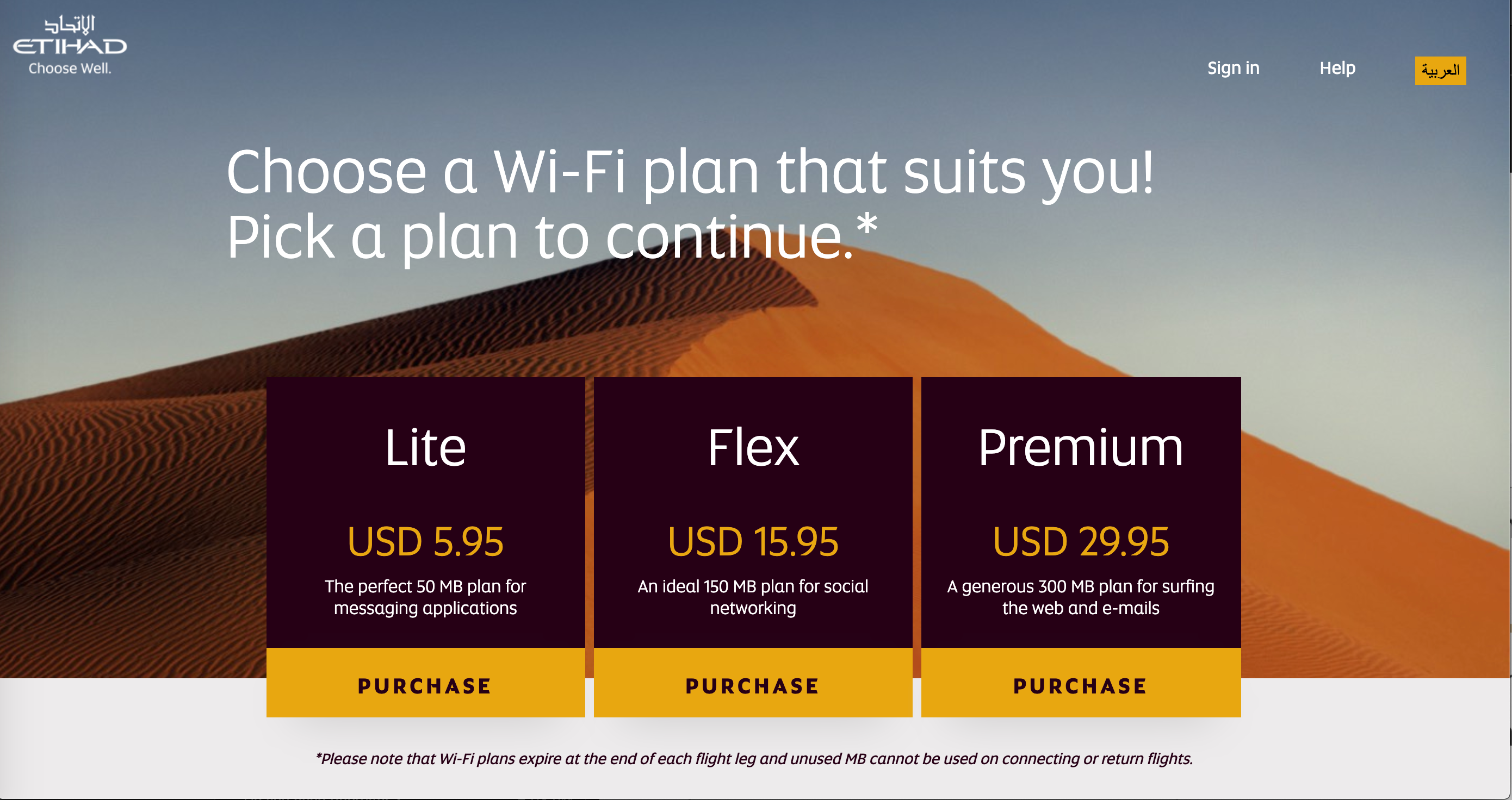 Etihad offered three Wi-Fi plans, starting at $5.95 for 50 MB to $29.95 for 300 MB.