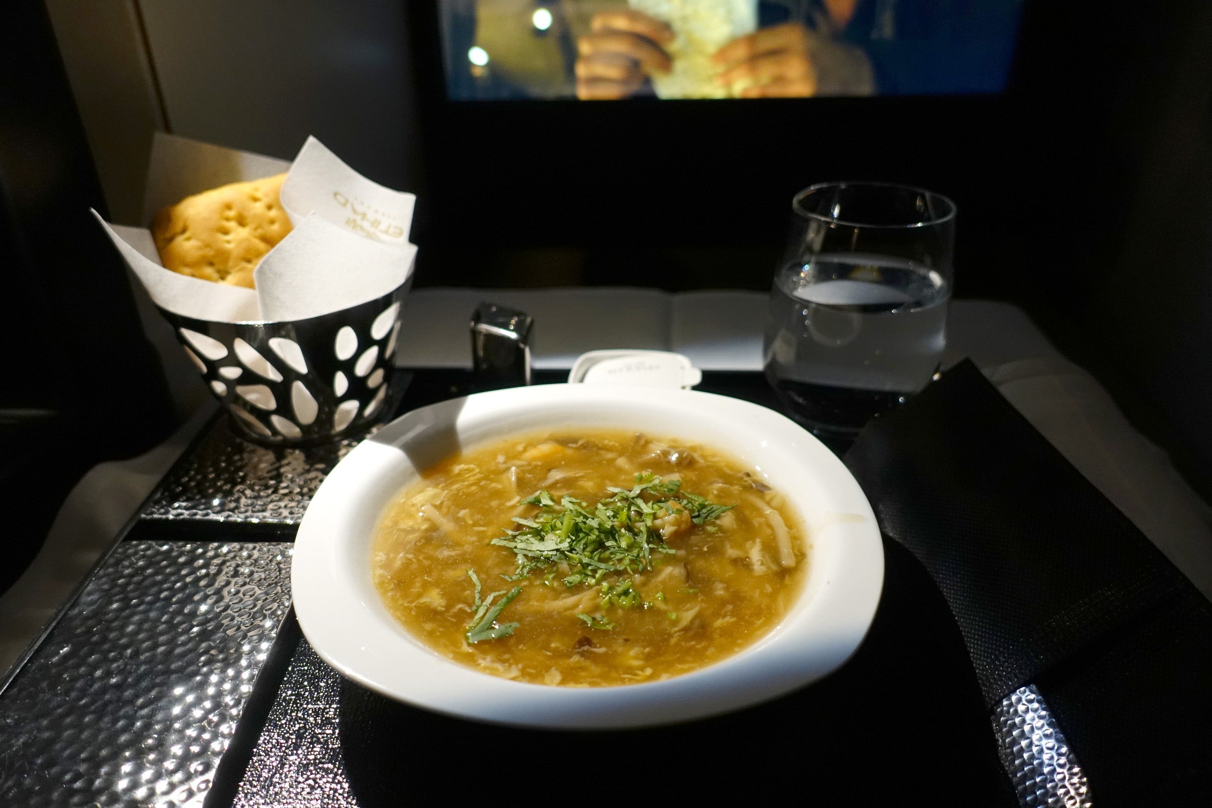 Given our 12:45am departure, it was a bit late to serve a full dinner. Instead, Etihad offers a mix of items that you can order at any time during the flight, including a steak sandwich, hot and sour seafood soup, cheese with crackers, fresh fruit and ice cream. I settled on the soup, which was flavorful. It arrived 40 minutes after takeoff alongside a small basket of bread and a glass of water.