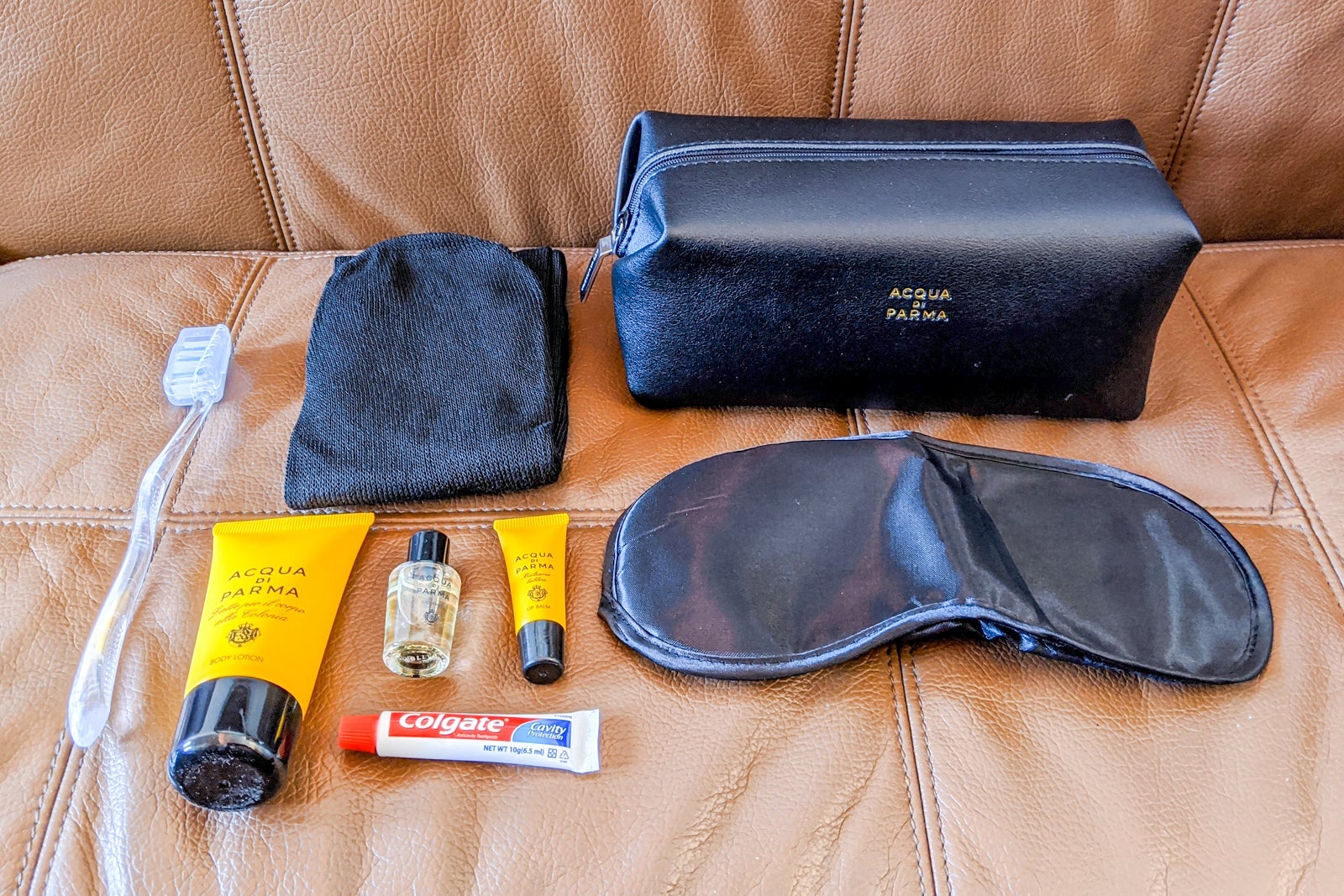 Shortly after I boarded, I was provided with an amenity kit which contained body lotion, lip balm, cologne, toothpaste, a toothbrush, socks and an eye mask. The eye mask was effective at blocking light, and was also comfortable because of the soft fabric lining on the inside.