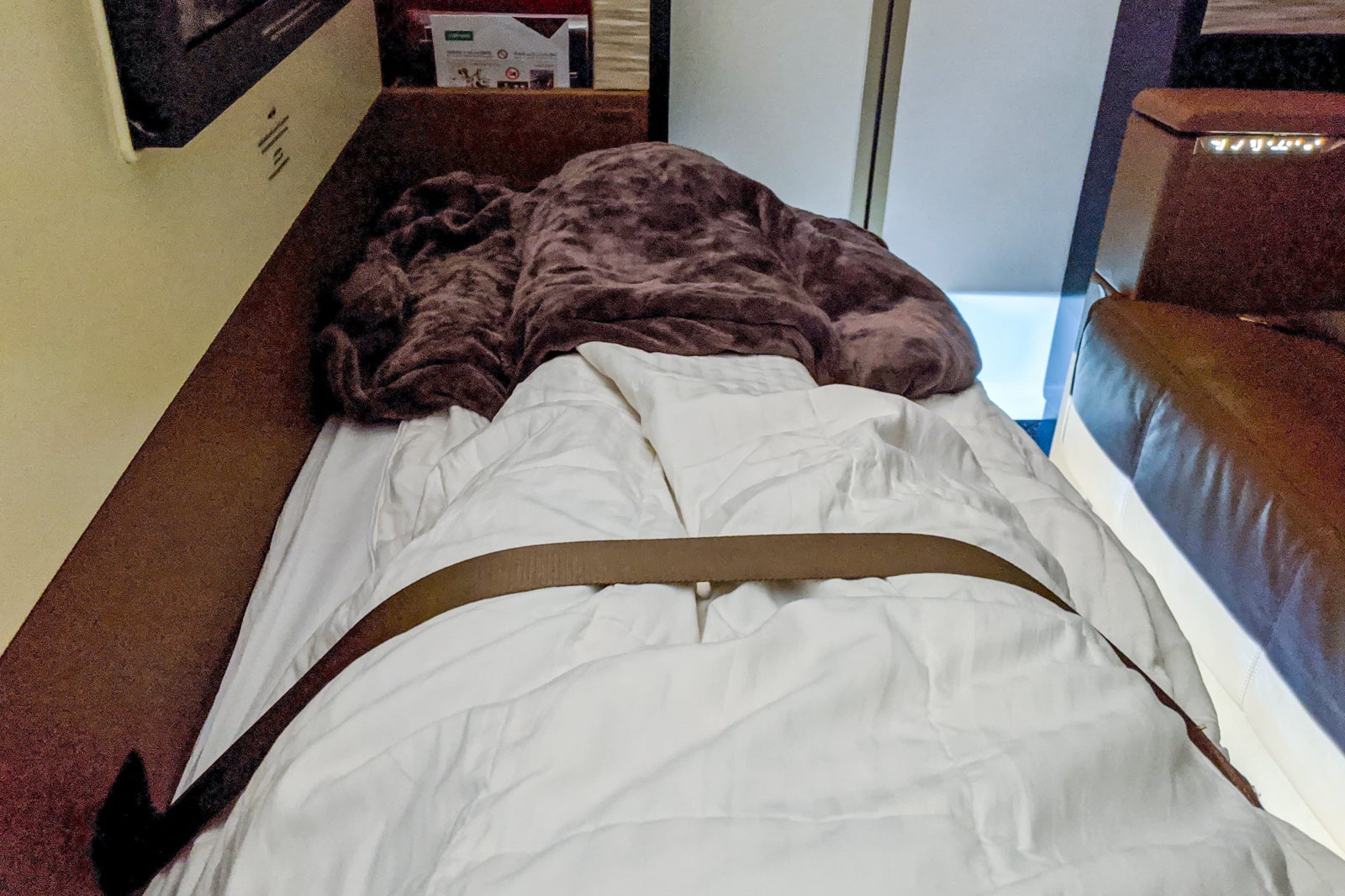 Upon request, a flight attendant made up my bed with double mattress pads, a comforter, a blanket and two pillows. (Additional pillows were available.)