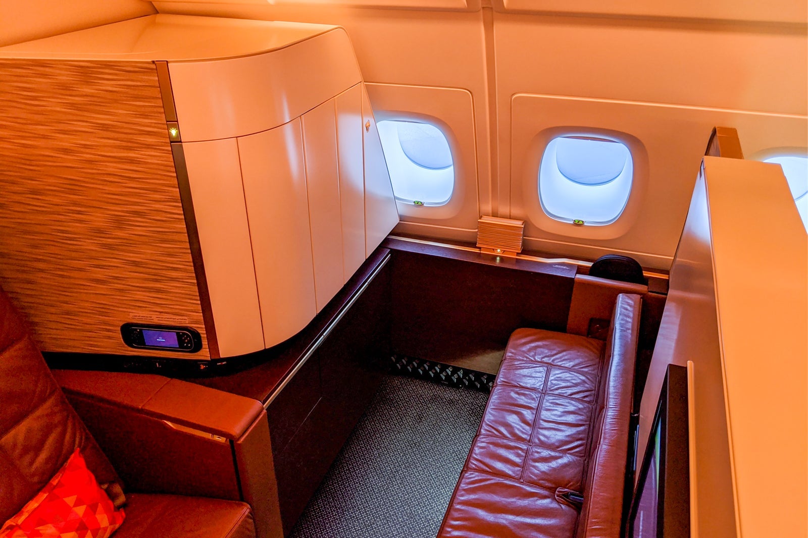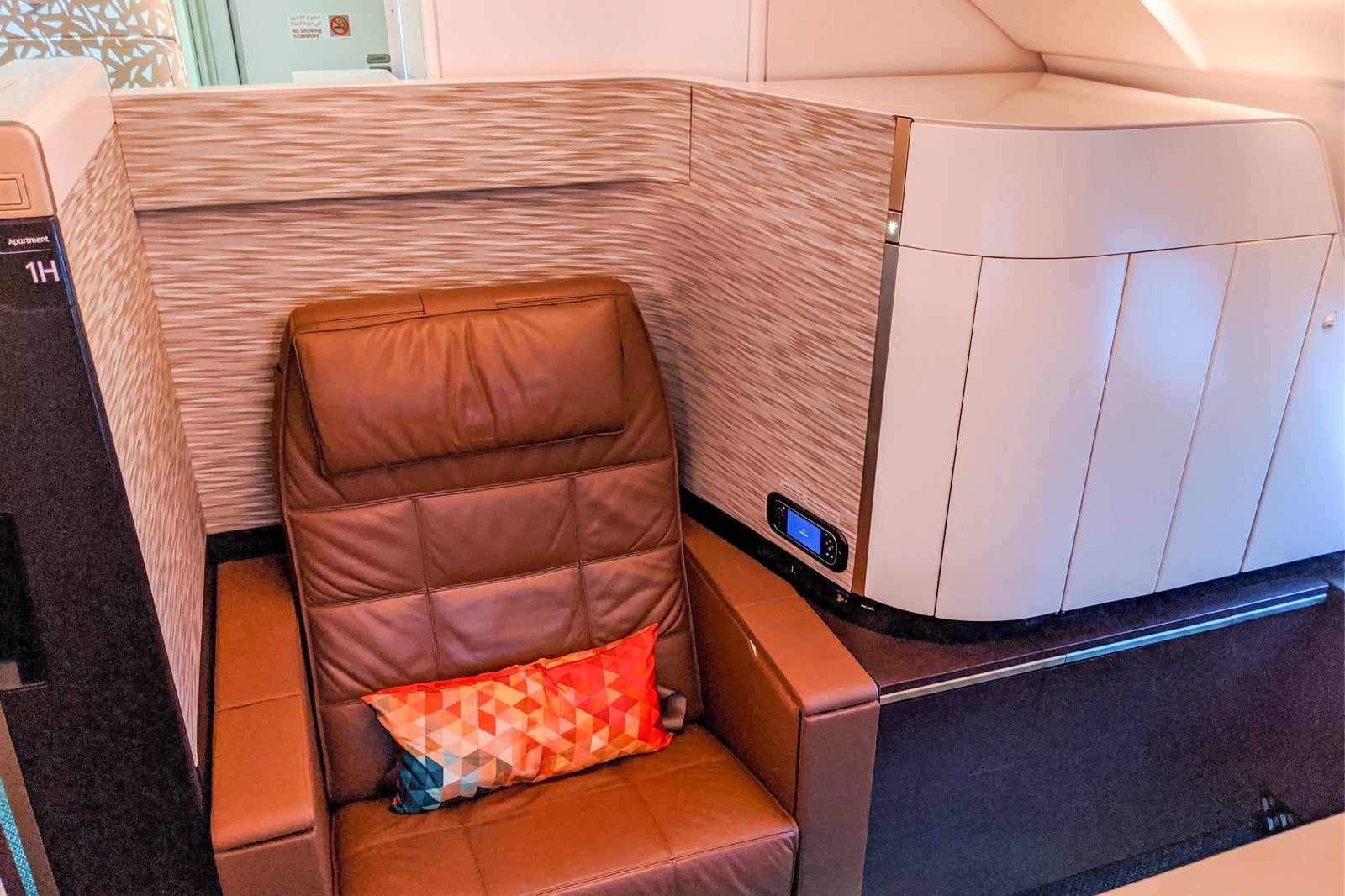 When I reached the upper deck aircraft door, the agent who was greeting passengers handed my boarding pass to another flight attendant, who introduced herself and guided me to my seat. She asked what I'd like to drink, and said she'd be back later in the boarding process to show me all the features of my Apartment.