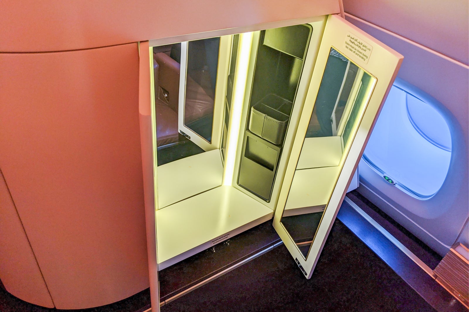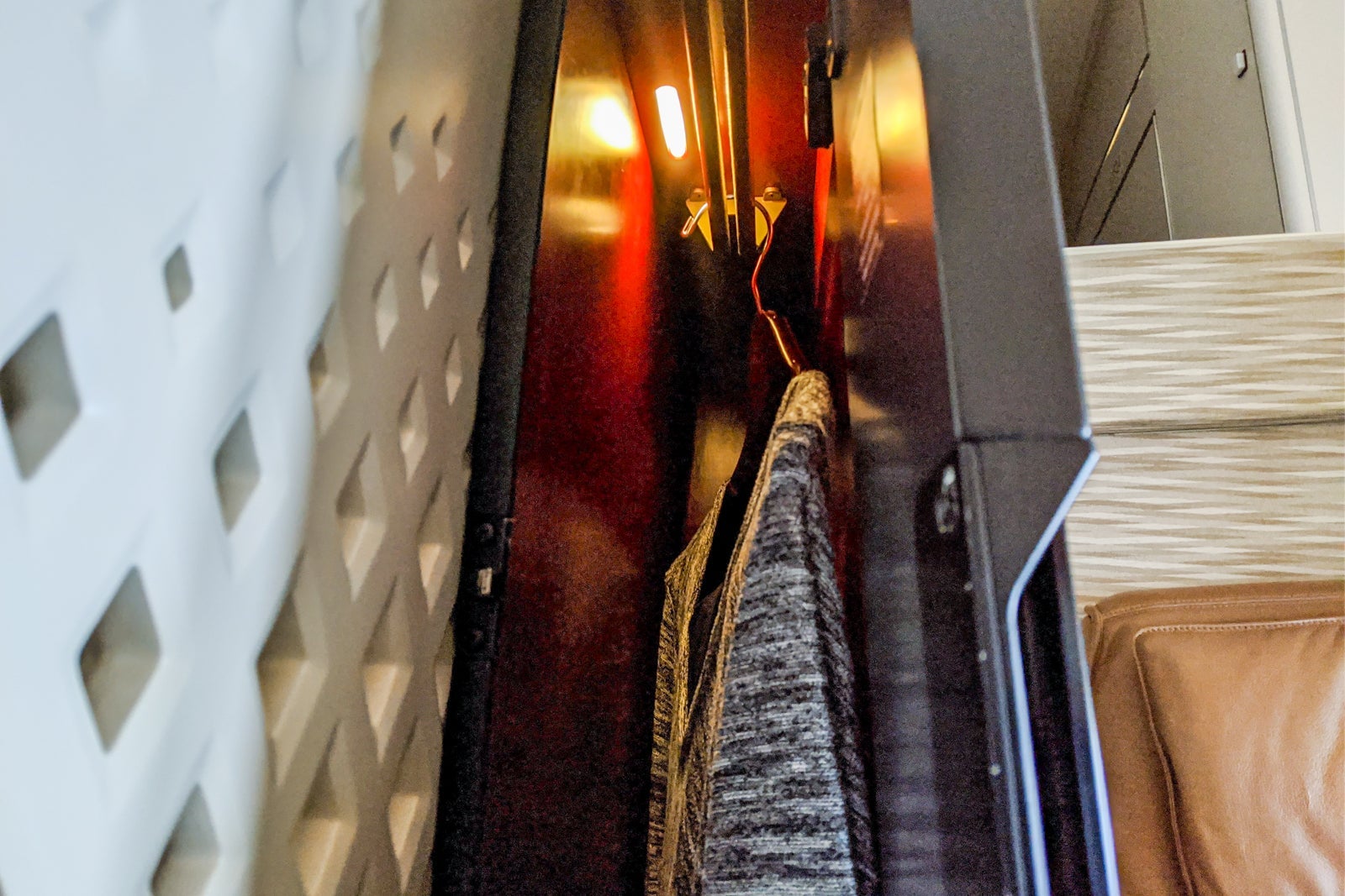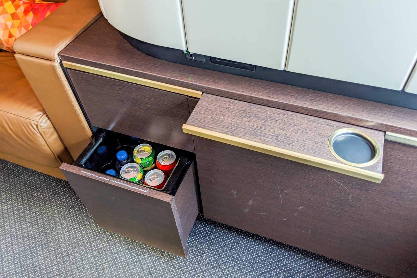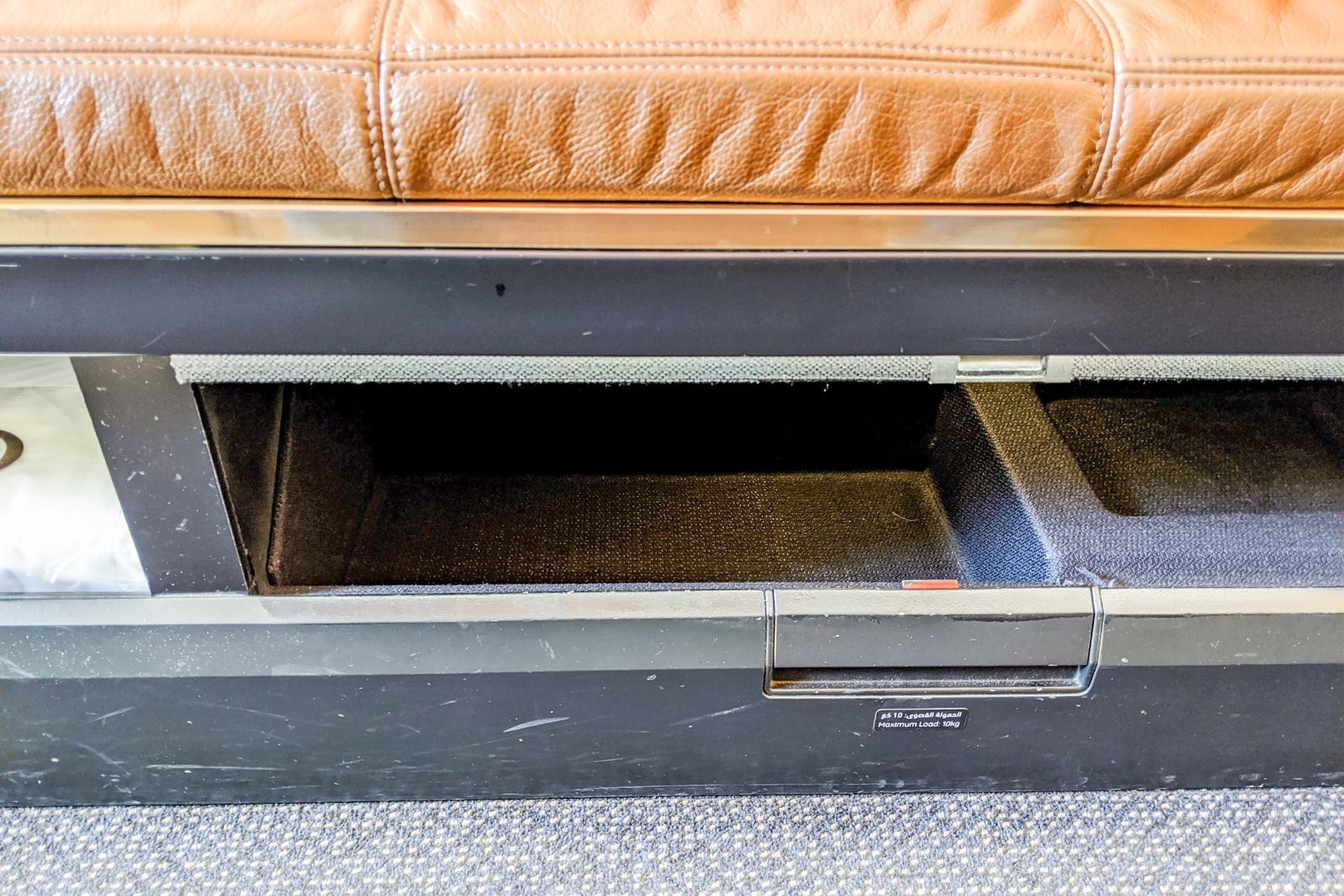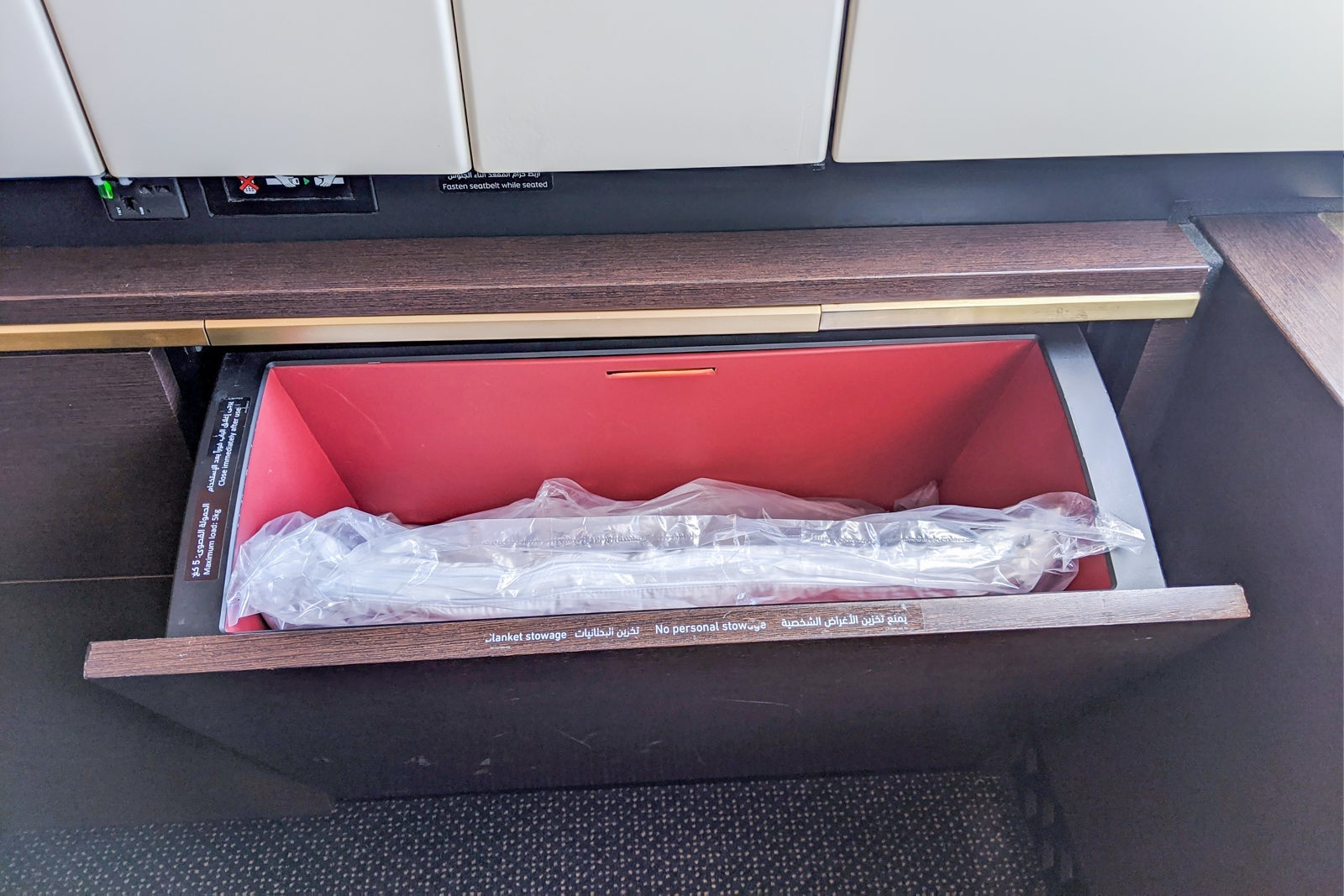 One of the other areas will hold a carry-on bag, and the fourth storage area contains bedding. There are no overhead bins in the first-class cabin.