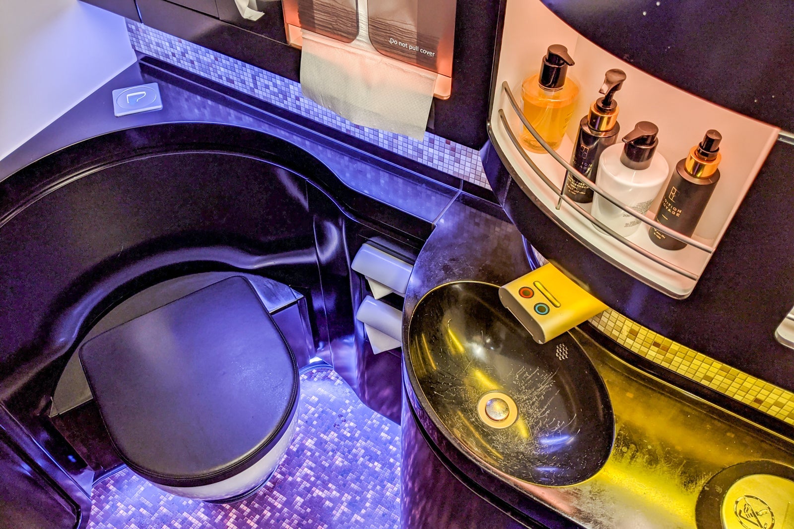 The lavatory farthest from my seat felt more spacious because it only has a toilet.