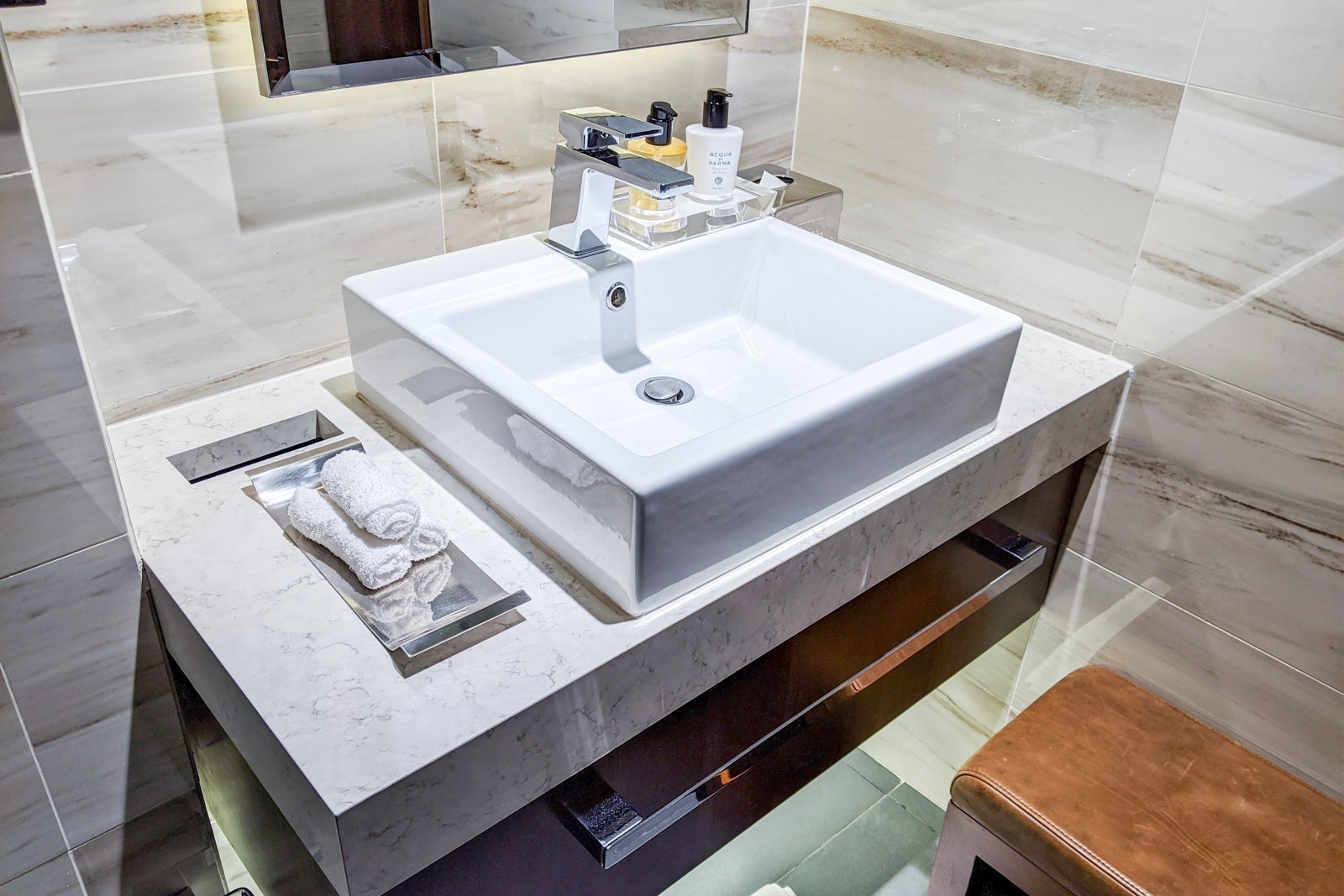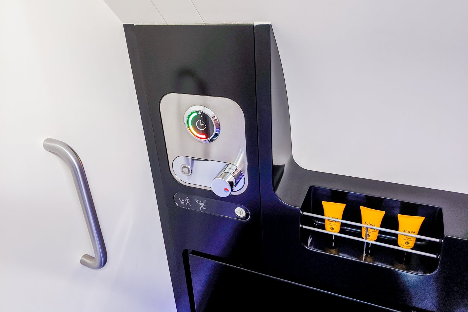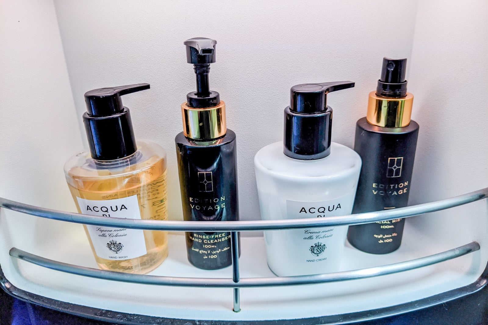 Both lavatories were stocked with hand wash, rinse-free hand cleanser, hand cream and facial spray plus cloth and paper towels.