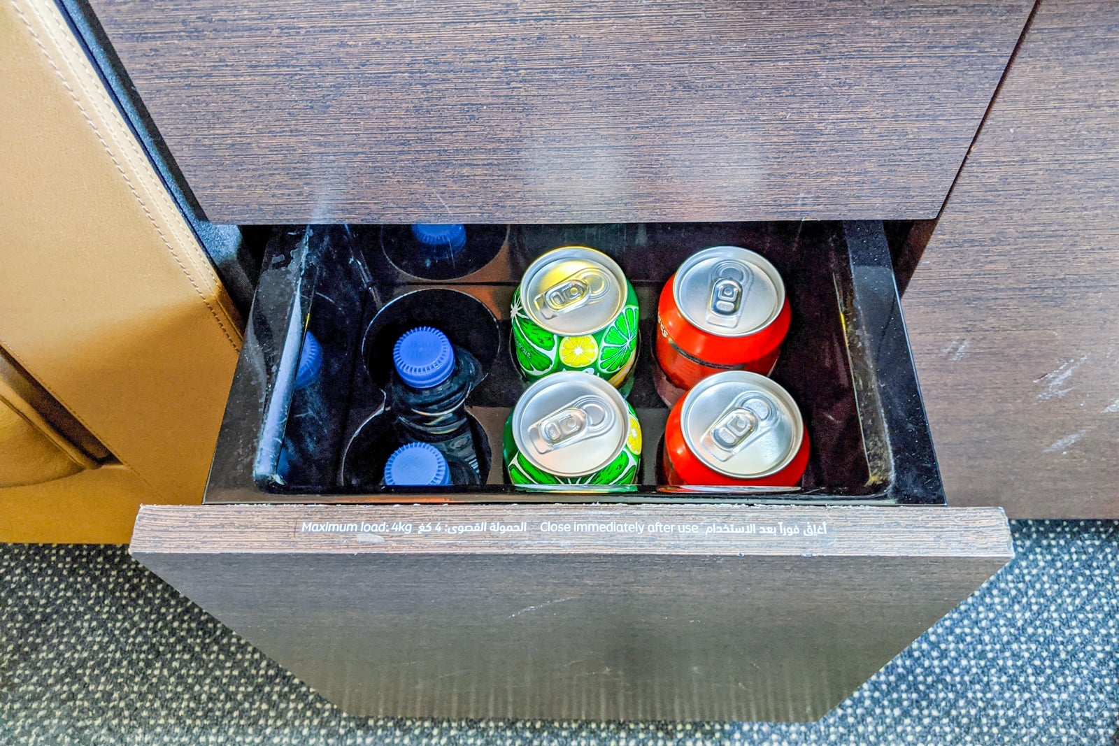 Below this cabinet is a refrigerated minibar stocked with Coke, Sprite and water.