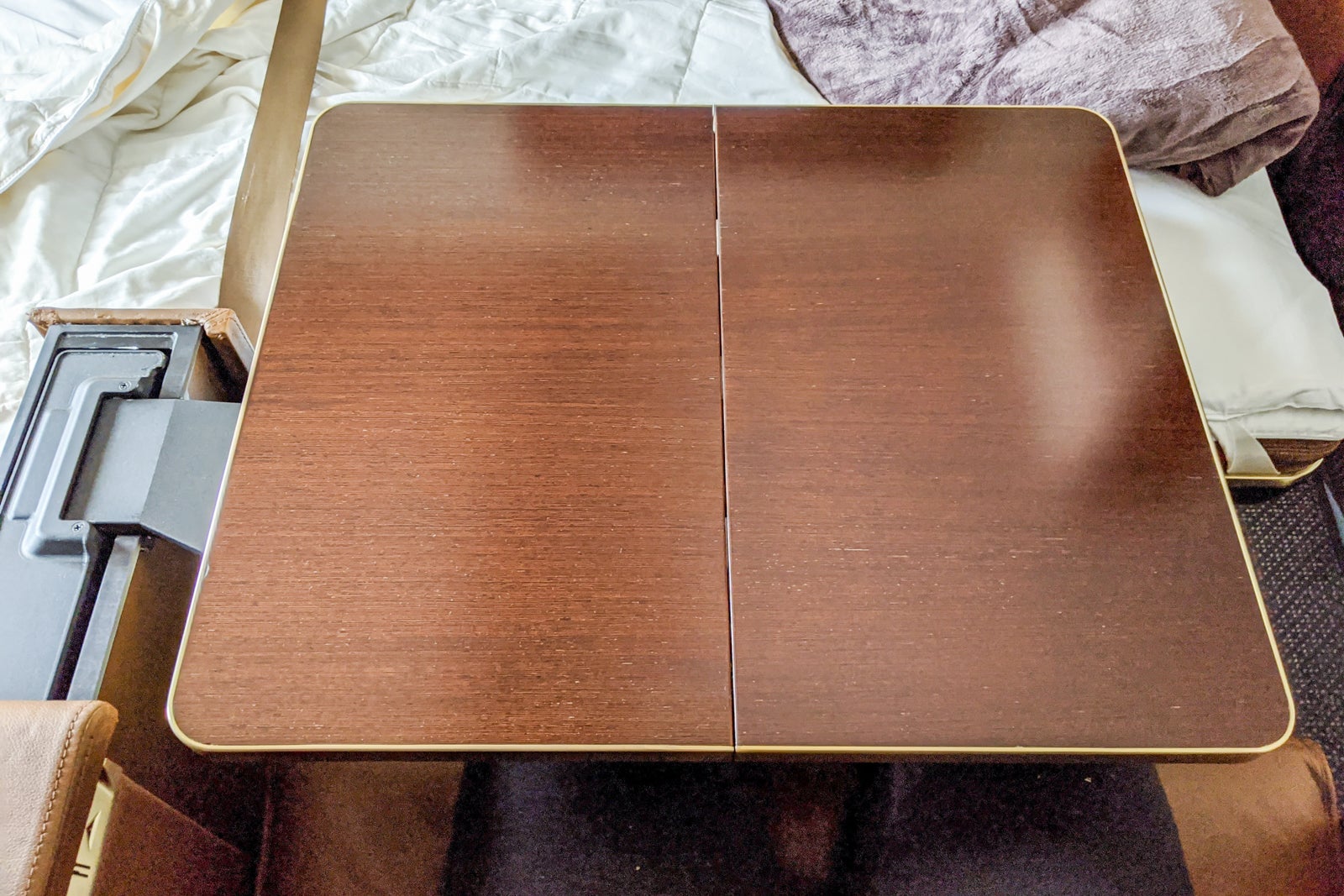 A bifold tray table expanding to 23x19 inches extends from the left armrest, although mine was difficult to deploy. You can slide the table forward or backward. If you are traveling with someone, that person can sit on the bench to join you for meals at this table.