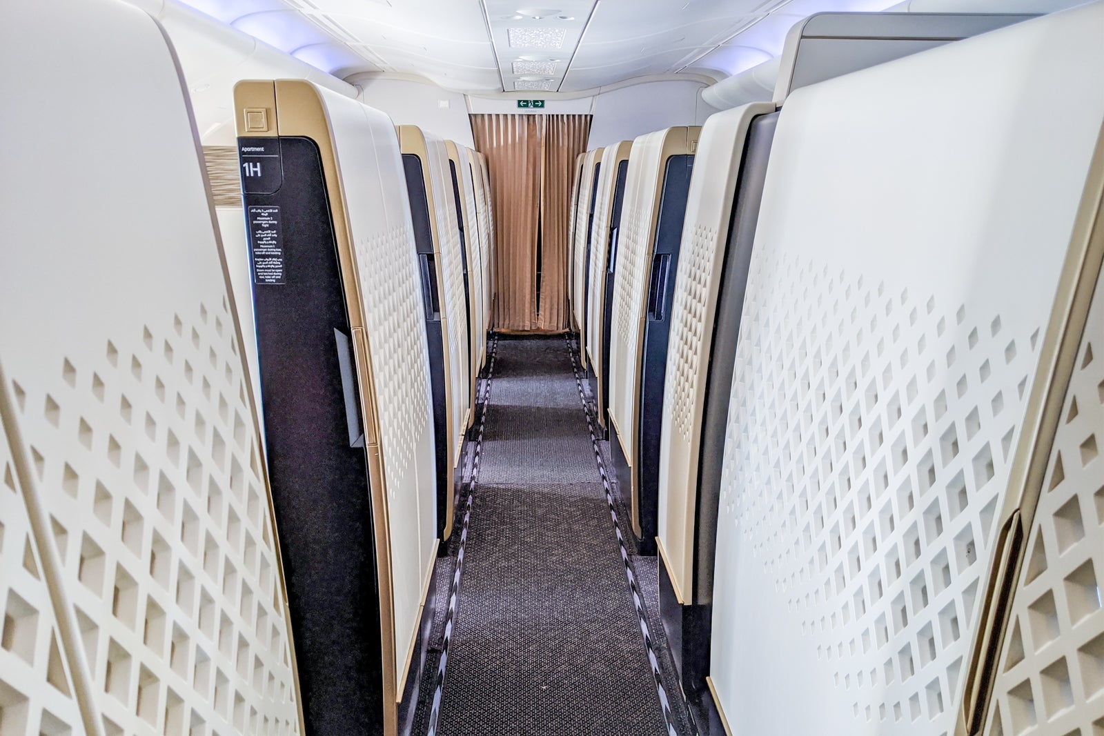Etihad's first-class cabin is outfitted with nine Apartments in a 1-1 configuration and one Residence. Each Apartment is enclosed, although the "walls" between Apartments don't reach all the way to the ceiling. Partitions between each Apartment are 54 inches tall and the walls between each Apartment and the aisle are 62 inches tall.