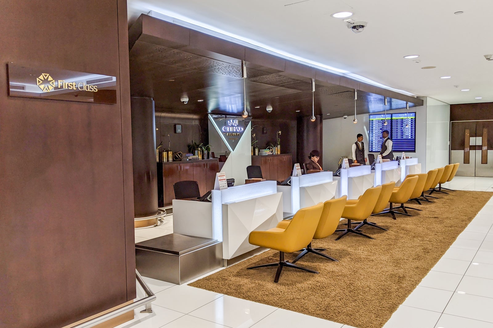 Etihad maintains a separate first-class check-in area in Abu Dhabi, but it's not especially well-marked once you're inside. Thanks to my husband JT's experience flying the same product last year, I knew to go all the way left past the business-class check-in area to the first-class area. There was one agent in this area as well as two luggage handlers.