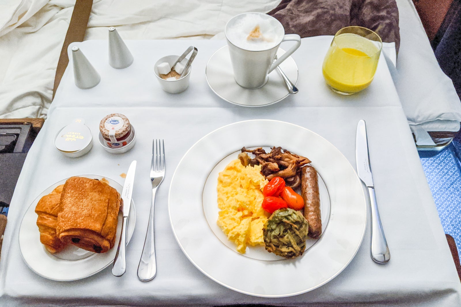 About two hours before landing, Chef Alex stopped by to see if I would be willing to eat breakfast and then shower -- which I later found was because of a delay in other passengers' showers. I agreed, so the flight attendants brought out the turmeric smoothie and a plate with a croissant and a chocolate pastry.