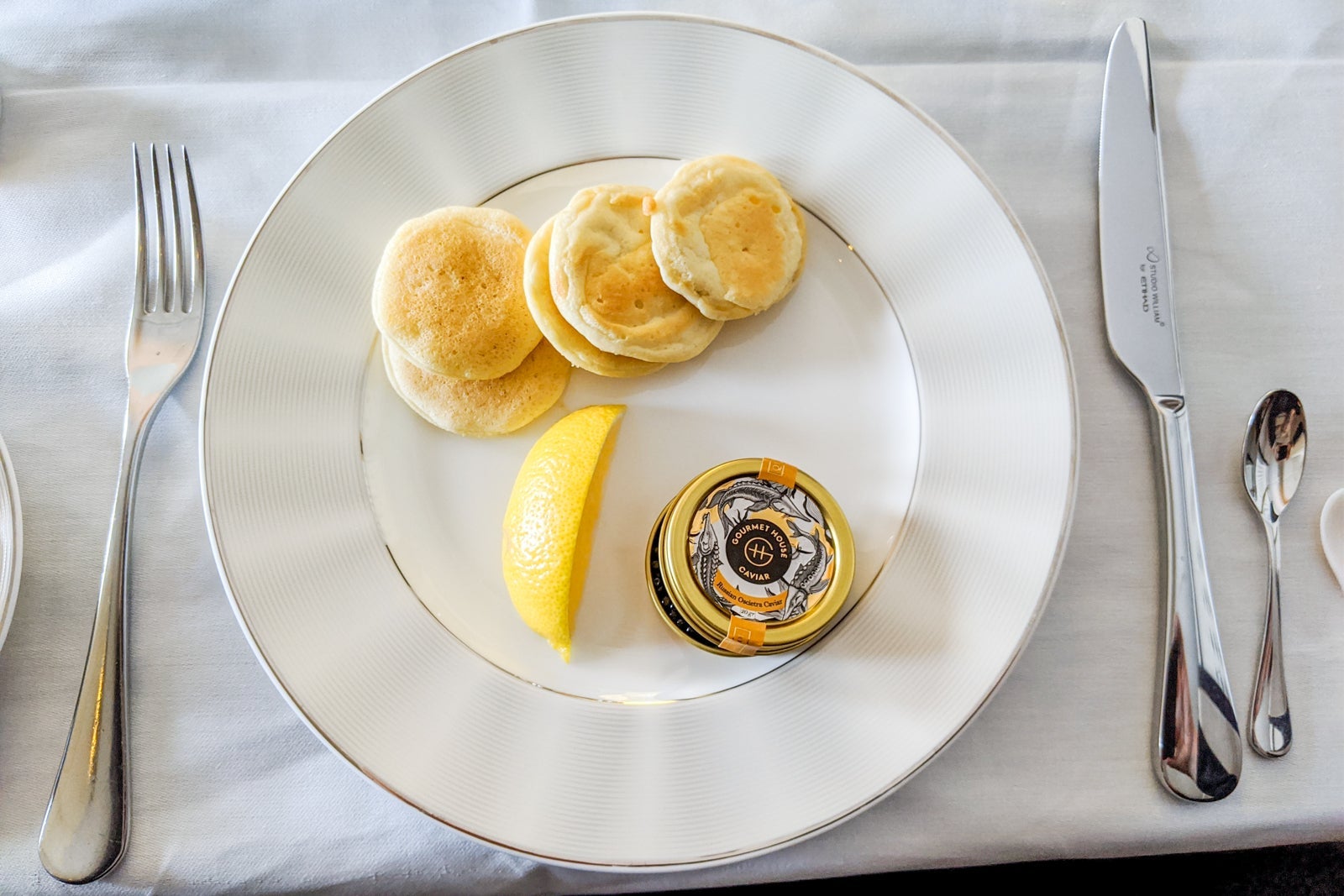 I was served a 20-gram serving of Gourmet House Oscietra, which retails for about $45. This was only my third time trying caviar, so I'm far from an expert. But I can say that the blinis were spongy and fresh, and the caviar itself less salty than what I tried in Cathay Pacific First