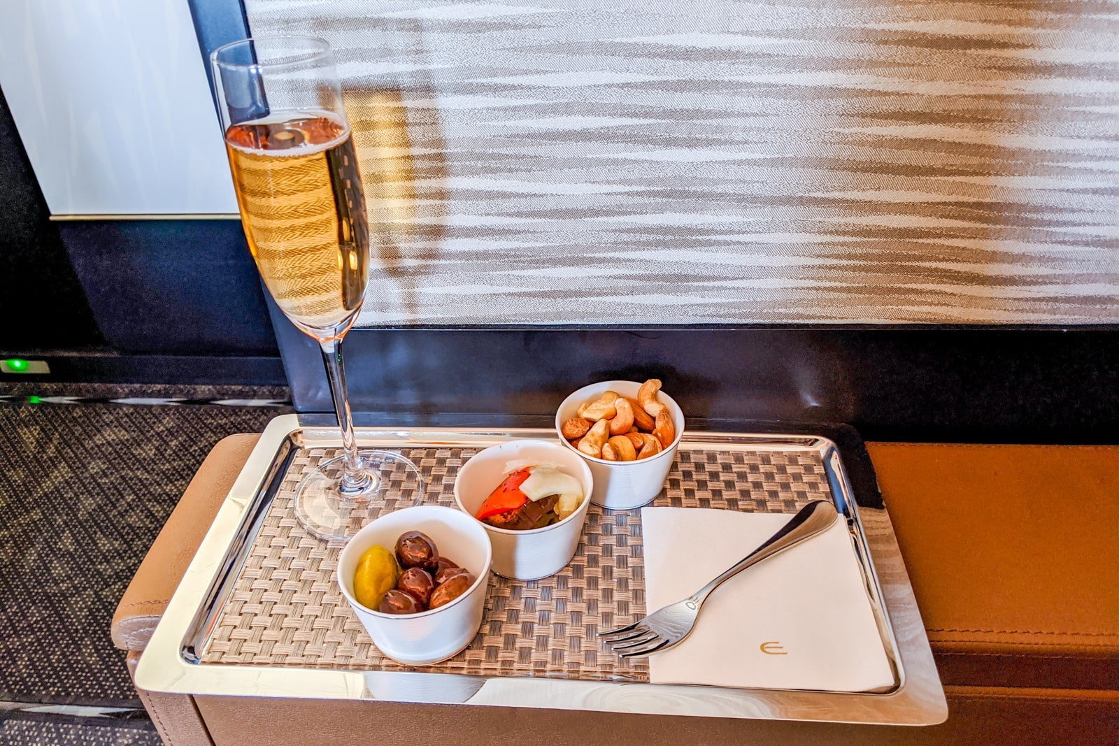 The service on board was generally great. A flight attendant showed me to my seat and served me a predeparture drink of my choice. Multiple flight attendants introduced themselves, and I was given a thorough tour of my Apartment before departure. I had to decline many offers to refill my champagne glass before takeoff, which may explain why drink refills weren't provided throughout the rest of the flight.