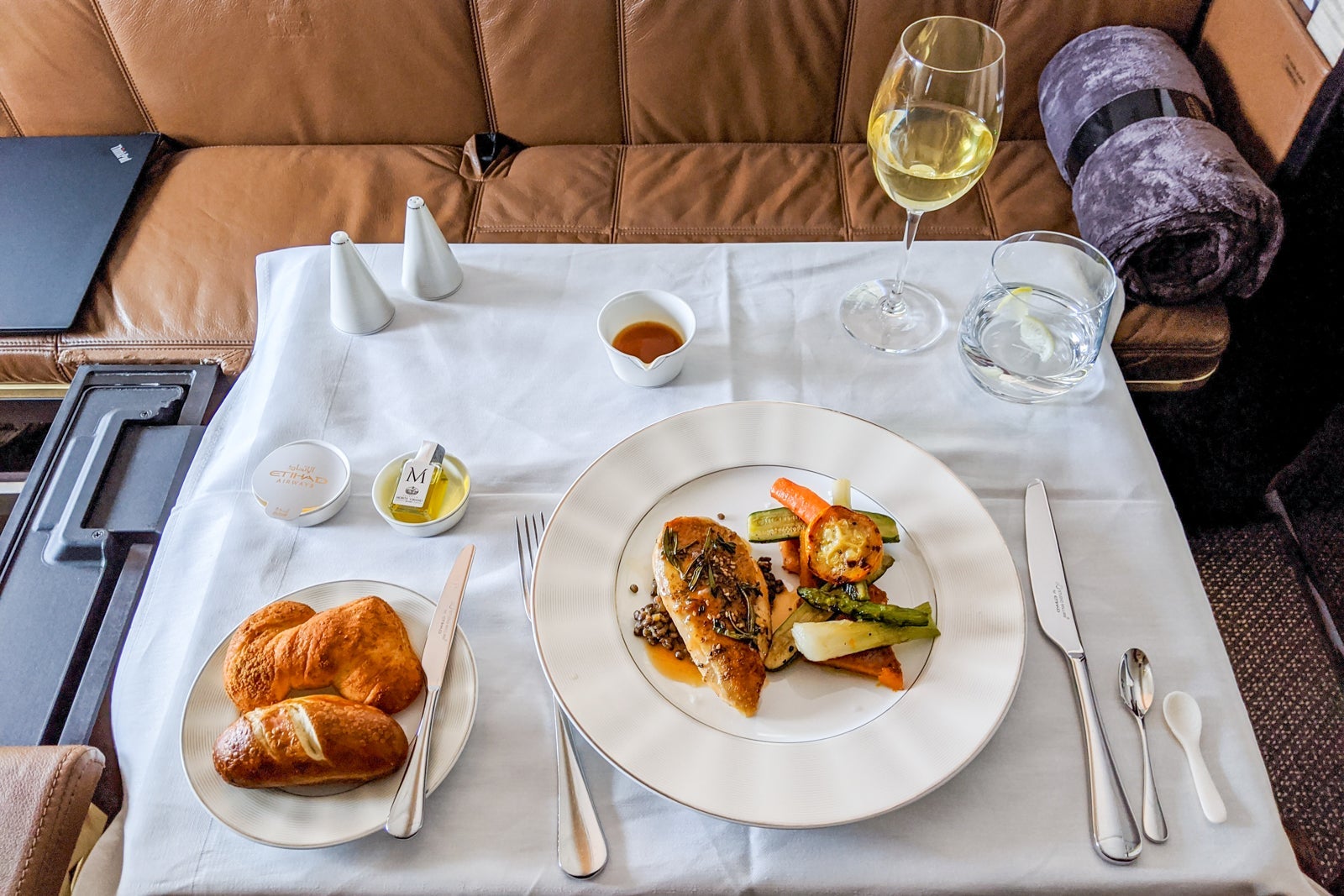 Russian Oscietra caviar was on the first-class menu, so I asked to start my departure meal with this service. Etihad served this delicacy with a mother-of-pearl spoon and all the traditional accompaniments. I asked for a drink pairing recommendation and the chef recommended the Hyde de Villaine chardonnay.