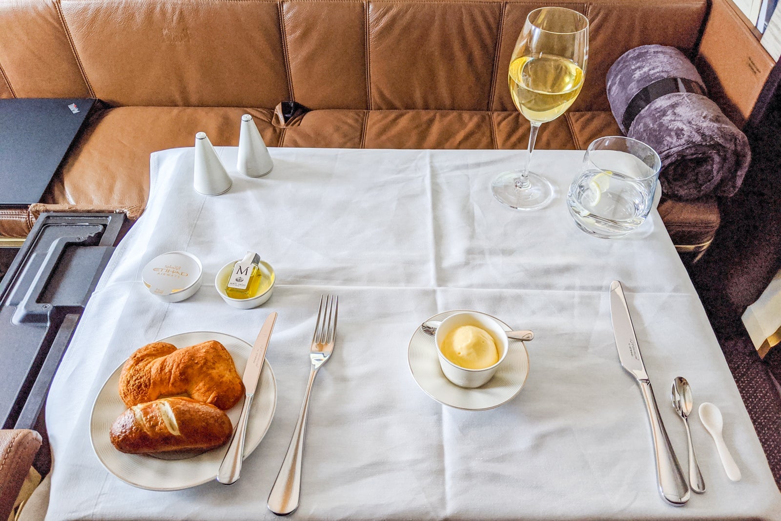 [flight_stats ticket-class="first" review-stat-section="Food and Beverage" tpg-rating="22" tpg-rating-max="25" live-tv="0" tailcam="0" headphones="0" meals="2" champagne="Charles Heidsieck Brut and Rose, 2006" dine-on-demand="Yes" comp-alcohol="0" extra-pillows="0" turndown-service="0" /]