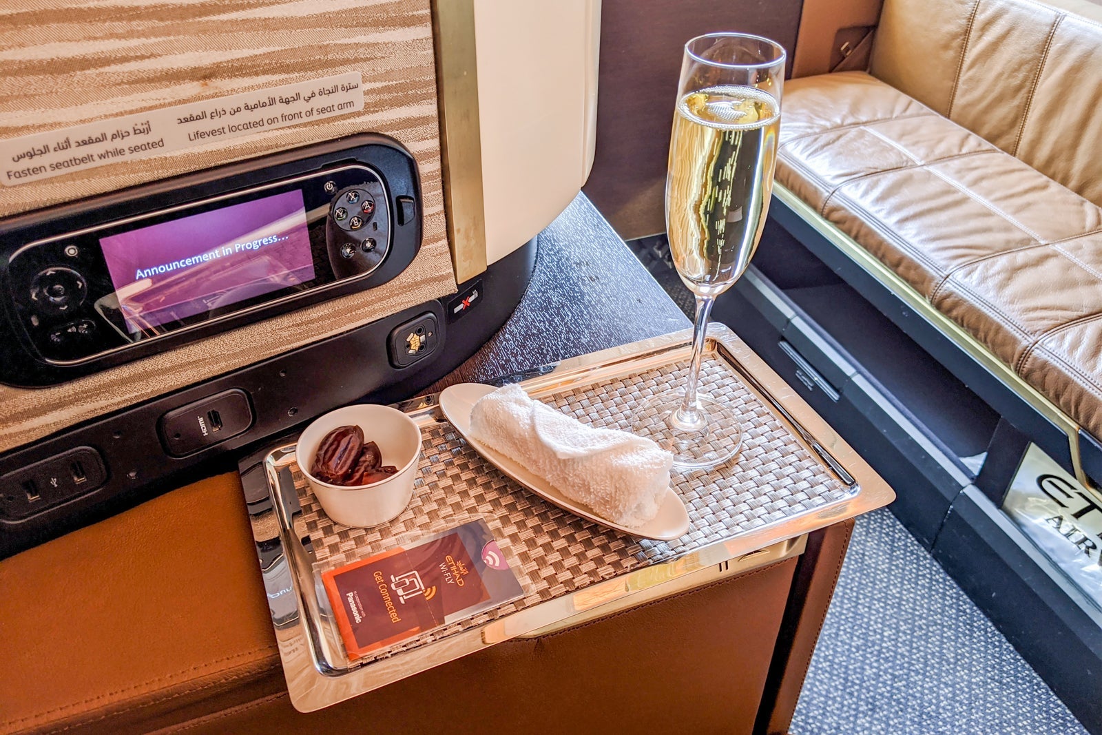 Shortly after I boarded, a glass of 2006 Charles Heidsieck Brut Champagne, dates and a warm towel arrived at my seat.