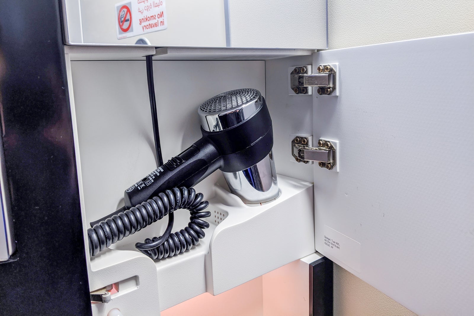 The lavatory closest to 1H is equipped with a shower, which occupies enough space to make it a rather tight squeeze, especially when dressing after a shower.