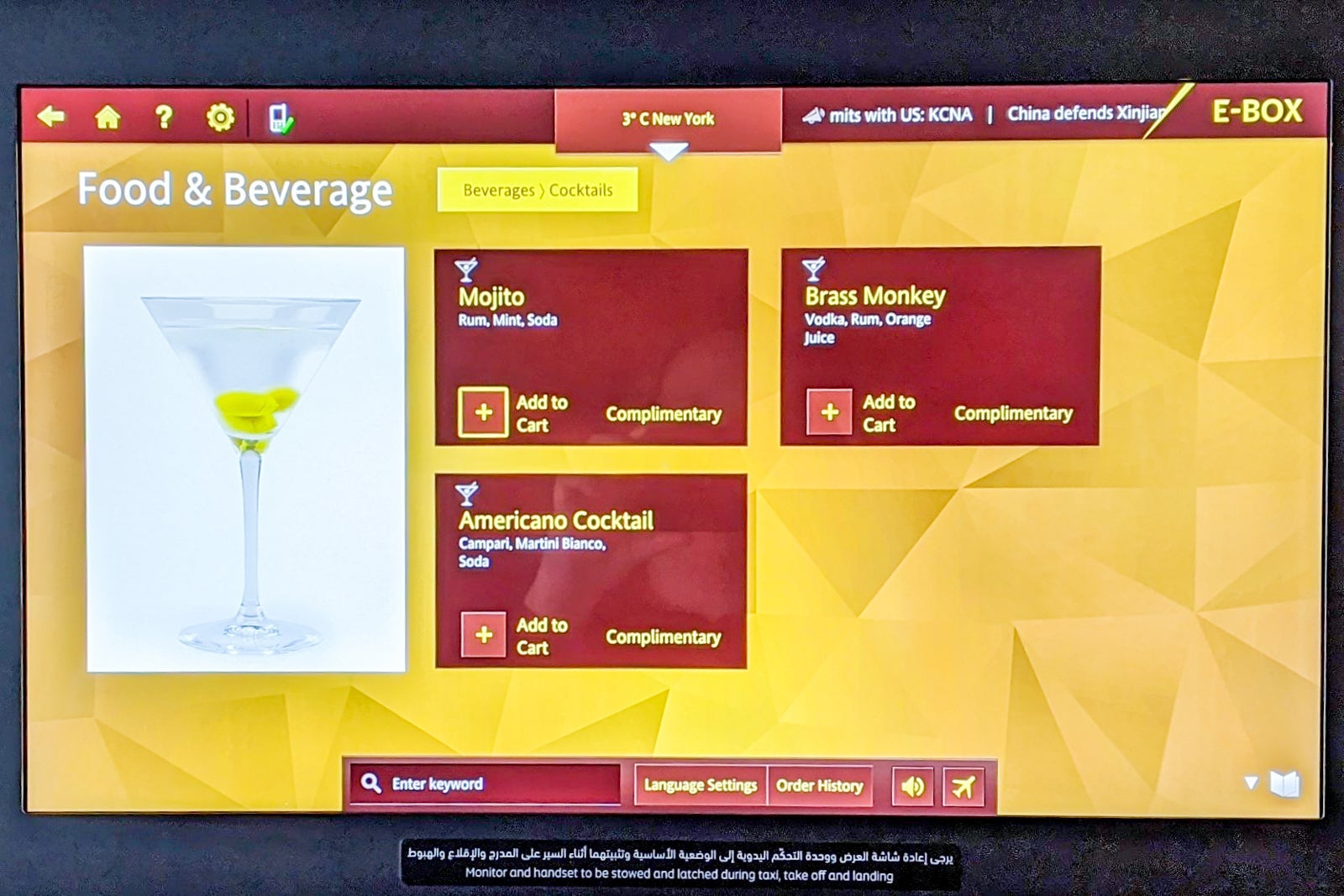 You can order drinks from your seat using the inflight entertainment (IFE) screen's Food & Beverage menu.