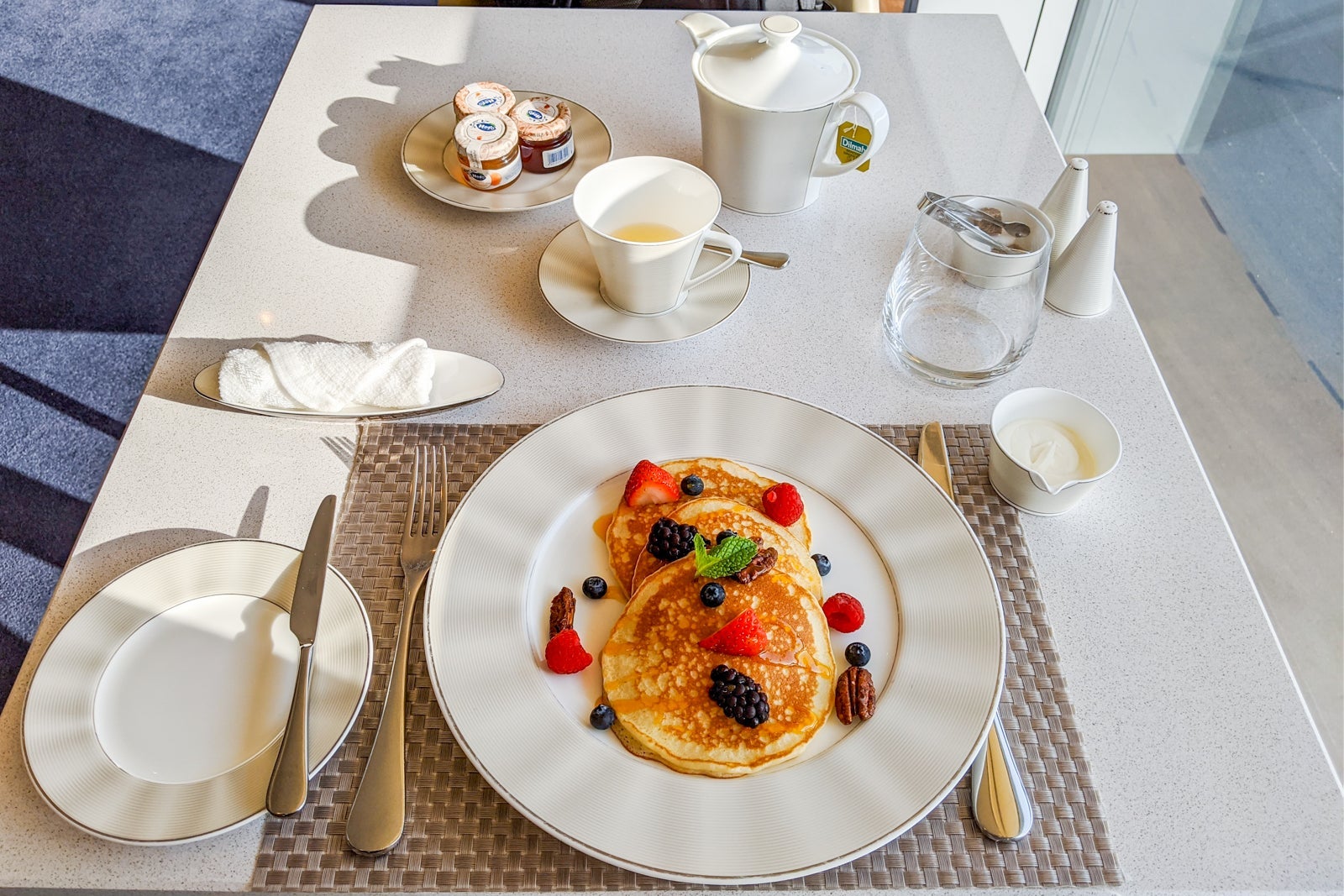 When the server returned, I ordered peppermint tea and pancakes. The server said they didn't have peppermint tea and suggested green tea with mint leaves, which was served in a small tea pot. My pancakes were served about 10 minutes later — freshly made, fluffy and topped with fresh berries.
