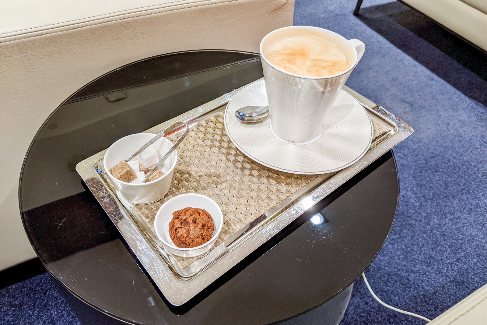 A lounge attendant quickly appeared with a cold towel. I ordered a cafe latte, which he served with a small cookie.