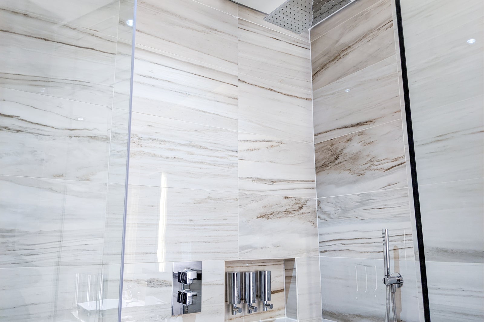 The gym shower has a shower wand and an overhead rainfall shower, but lacks amenities.