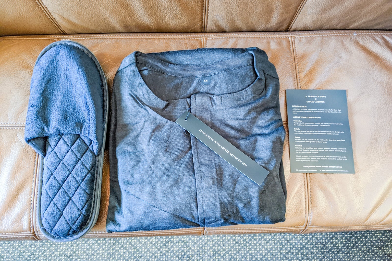 A pair of soft and well-fitting pajamas were delivered to my seat during boarding. They are definitely keepers. A pair of foam-soled slippers was also provided.