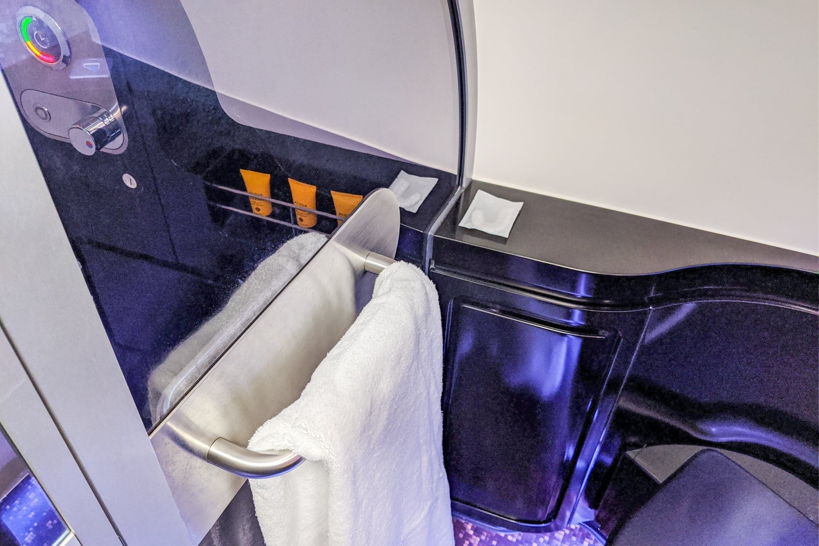 Later in the boarding process, he came by to explain that the dine-on-demand format allows for any meal to be served at any time. At this time, he asked for my meal orders for the rest of the flight, and set up a shower time for me. I decided to have my departure meal about two hours after take off, my shower about two hours before landing and my arrival meal after my shower.