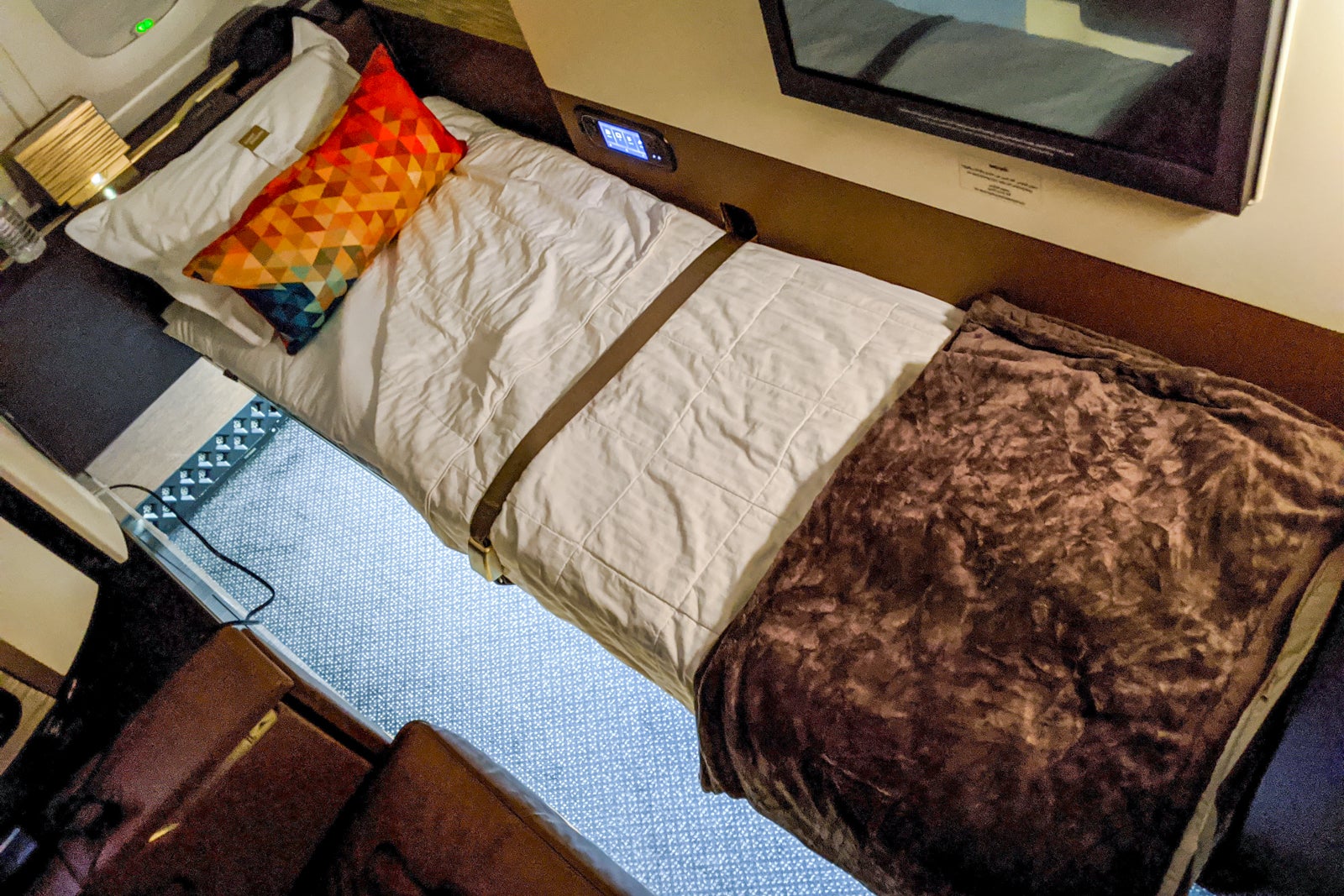 Upon request, a flight attendant made up my bed with double mattress pads, a comforter, a blanket and two pillows. (Additional pillows were available.)