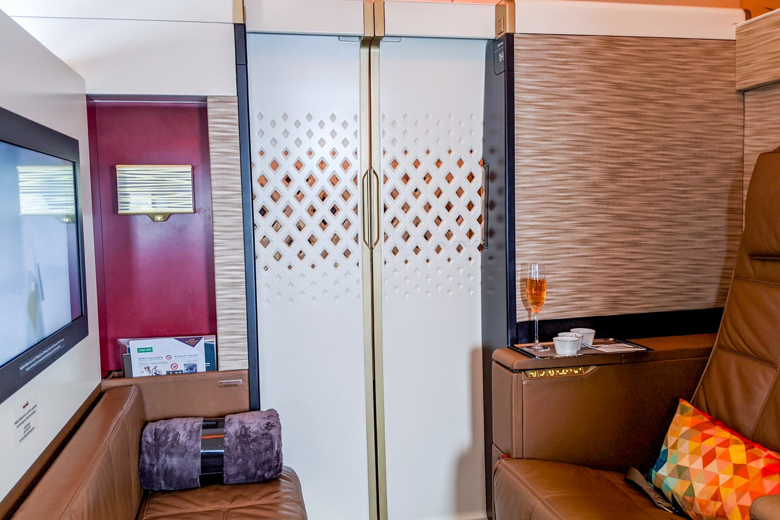 When I reached the upper deck aircraft door, the agent who was greeting passengers handed my boarding pass to another flight attendant, who introduced herself and guided me to my seat. She asked what I'd like to drink, and said she'd be back later in the boarding process to show me all the features of my Apartment.