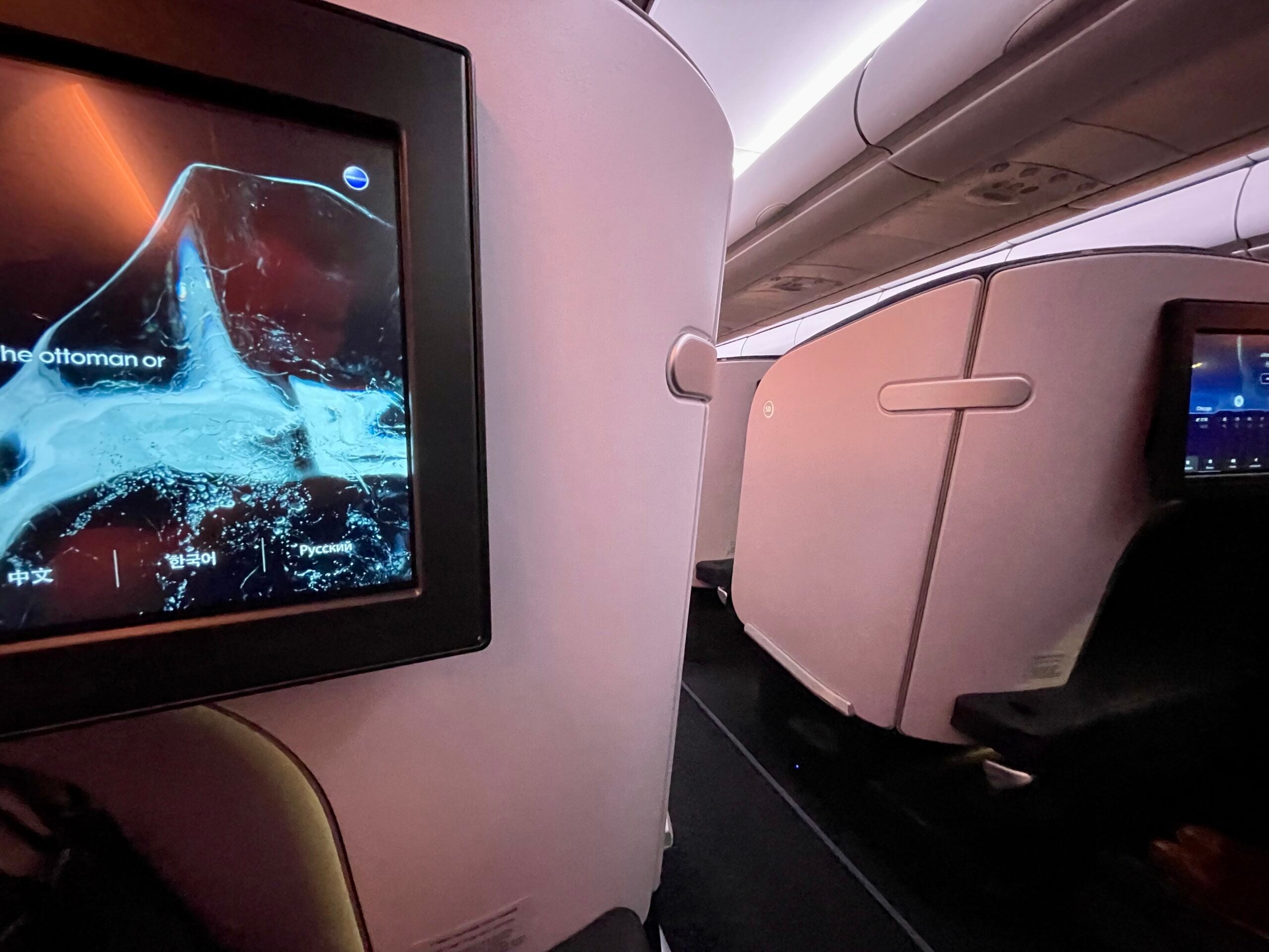You aren't completely shielded from noise or movement in the aisle, however, due to the walls and the staggered layout, you can't see the passenger across from you eating — you'll only get a glimpse of what they're watching on their entertainment screen and their legs when they're lying down.