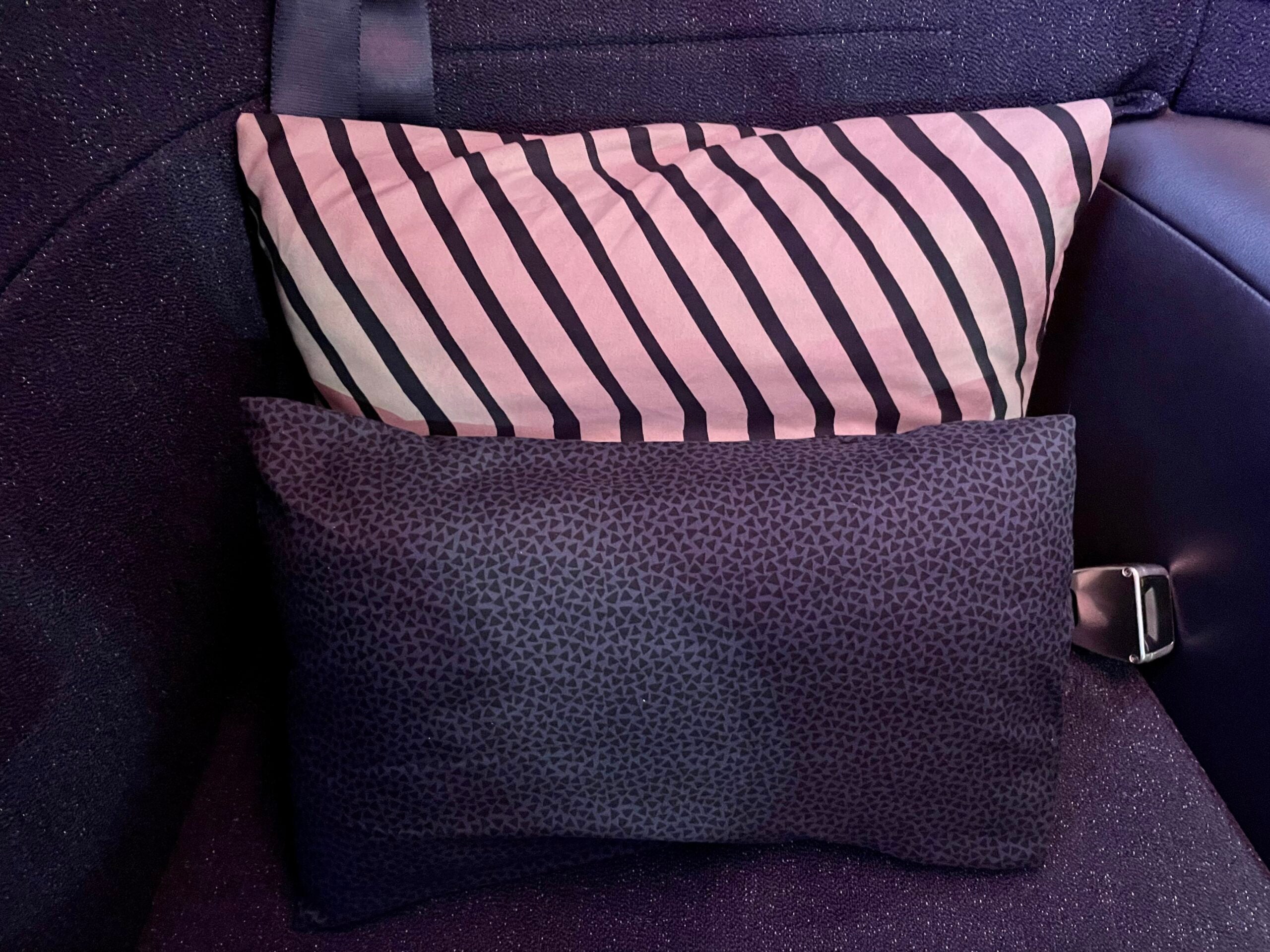 Even with the two pillows providing limited support to my back when I was eating and watching entertainment on the screen, I got cramps in my neck, shoulders and back that I usually don't get when in a more "supported" or traditional business-class seat. I think asking for some extra pillows from the cabin crew would help to mitigate this but, still, the design of the seat does not have any curvature for your spine.